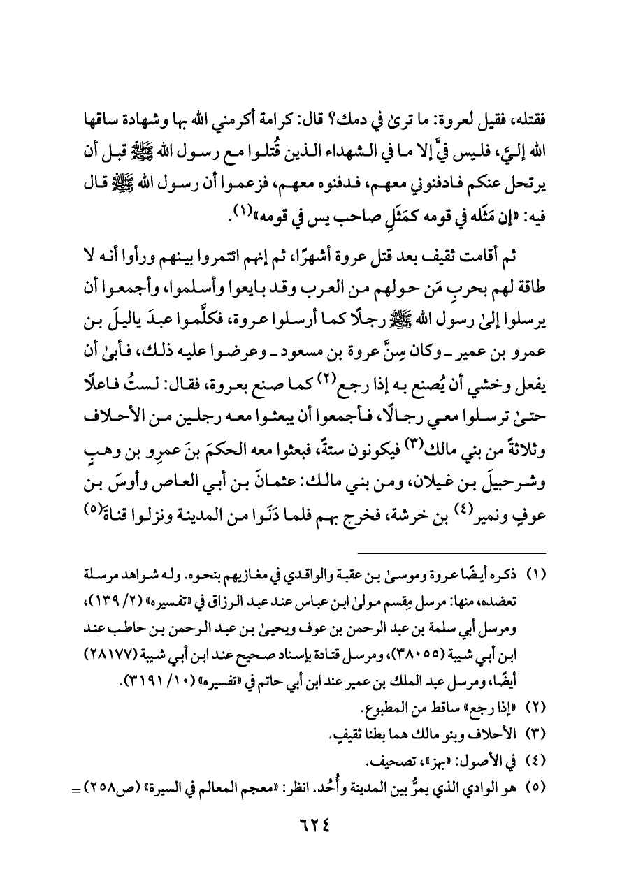 ثم أقامت ثقيف بعد قتل عروة أشهرًا، ثم إنهم ائتمروا بينهم ورأوا أنه لا طاقة لهم بحربِ مَن حولهم من العرب وقد بايعوا وأسلموا، وأجمعوا أن يرسلوا إلى رسول الله - صلى الله عليه وسلم - رجلًا كما أرسلوا عروة، فكلَّموا عبدَ ياليلَ بن عمرو بن عمير ــ وكان سِنَّ عروة بن مسعود ــ وعرضوا عليه ذلك، فأبى أن يفعل وخشي أن يُصنع به إذا رجع (¬٢) كما صنع بعروة، فقال: لستُ فاعلًا حتى ترسلوا معي رجالًا، فأجمعوا أن يبعثوا معه رجلين من الأحلاف وثلاثةً من بني مالك (¬٣) فيكونون ستةً، فبعثوا معه الحكمَ بنَ عمرِو بن وهبٍ وشرحبيلَ بن غيلان، ومن بني مالك: عثمانَ بن أبي العاص وأوسَ بن عوفٍ ونمير (¬٤) بن خرشة، فخرج بهم فلما دَنَوا من المدينة ونزلوا قناةَ (¬٥)