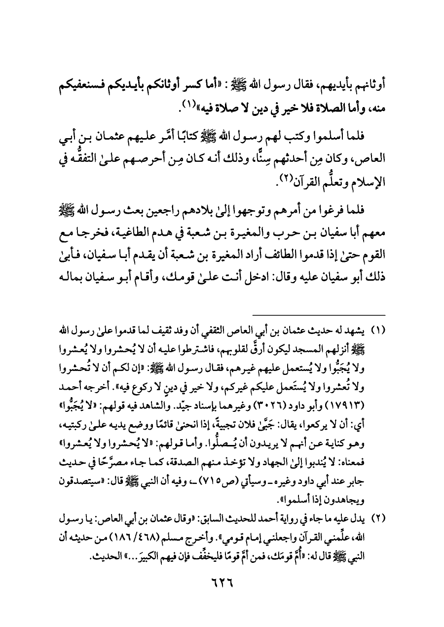 (¬١) يشهد له حديث عثمان بن أبي العاص الثقفي أن وفد ثقيف لما قدموا على رسول الله - صلى الله عليه وسلم - أنزلهم المسجد ليكون أرقَّ لقلوبهم، فاشترطوا عليه أن لا يُحشروا ولا يُعشروا ولا يُجَبُّوا ولا يُستعمل عليهم غيرهم، فقال رسول الله - صلى الله عليه وسلم -: «إن لكم أن لا تُحشروا ولا تُعشروا ولا يُستَعمل عليكم غيركم، ولا خير في دينٍ لا ركوع فيه». أخرجه أحمد (١٧٩١٣) وأبو داود (٣٠٢٦) وغيرهما بإسناد جيّد. والشاهد فيه قولهم: «لا يُجَبُّوا» أي: أن لا يركعوا، يقال: جَبَّى فلان تجبيةً، إذا انحنى قائمًا ووضع يديه على ركبتيه، وهو كناية عن أنهم لا يريدون أن يُصلُّوا. وأما قولهم: «لا يُحشروا ولا يُعشروا» فمعناه: لا يُندبوا إلى الجهاد ولا تؤخذ منهم الصدقة، كما جاء مصرَّحًا في حديث جابر عند أبي داود وغيره ــ وسيأتي (ص ٧١٥) ــ، وفيه أن النبي - صلى الله عليه وسلم - قال: «سيتصدقون ويجاهدون إذا أسلموا».