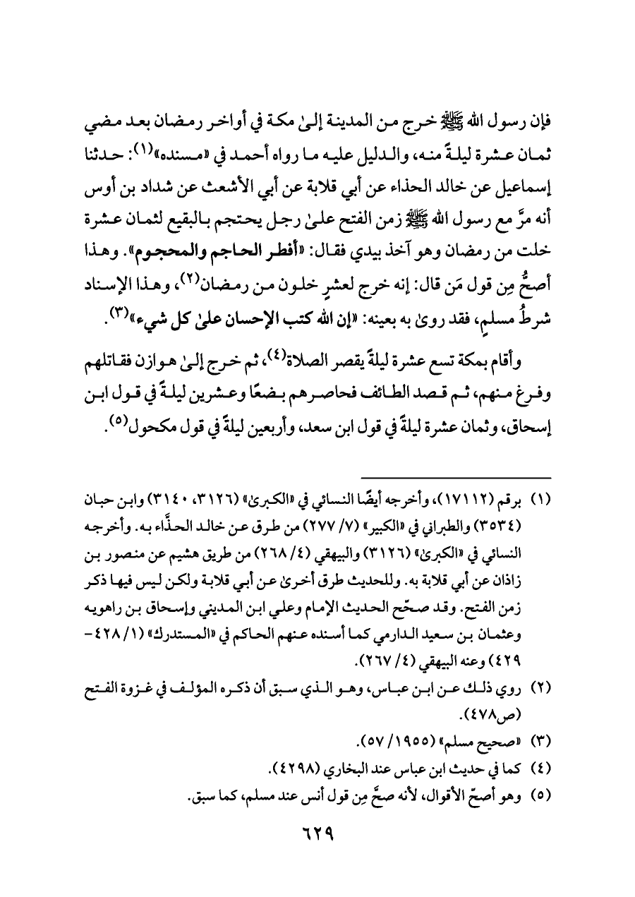 فإن رسول الله - صلى الله عليه وسلم - خرج من المدينة إلى مكة في أواخر رمضان بعد مضي ثمان عشرة ليلةً منه، والدليل عليه ما رواه أحمد في «مسنده» (¬١): حدثنا إسماعيل عن خالد الحذاء عن أبي قلابة عن أبي الأشعث عن شداد بن أوس أنه مرَّ مع رسول الله - صلى الله عليه وسلم - زمن الفتح على رجل يحتجم بالبقيع لثمان عشرة خلت من رمضان وهو آخذ بيدي فقال: «أفطر الحاجم والمحجوم». وهذا أصحُّ مِن قول مَن قال: إنه خرج لعشرٍ خلون من رمضان (¬٢)، وهذا الإسناد شرطُ مسلمٍ، فقد روى به بعينه: «إن الله كتب الإحسان على كل شيء» (¬٣).