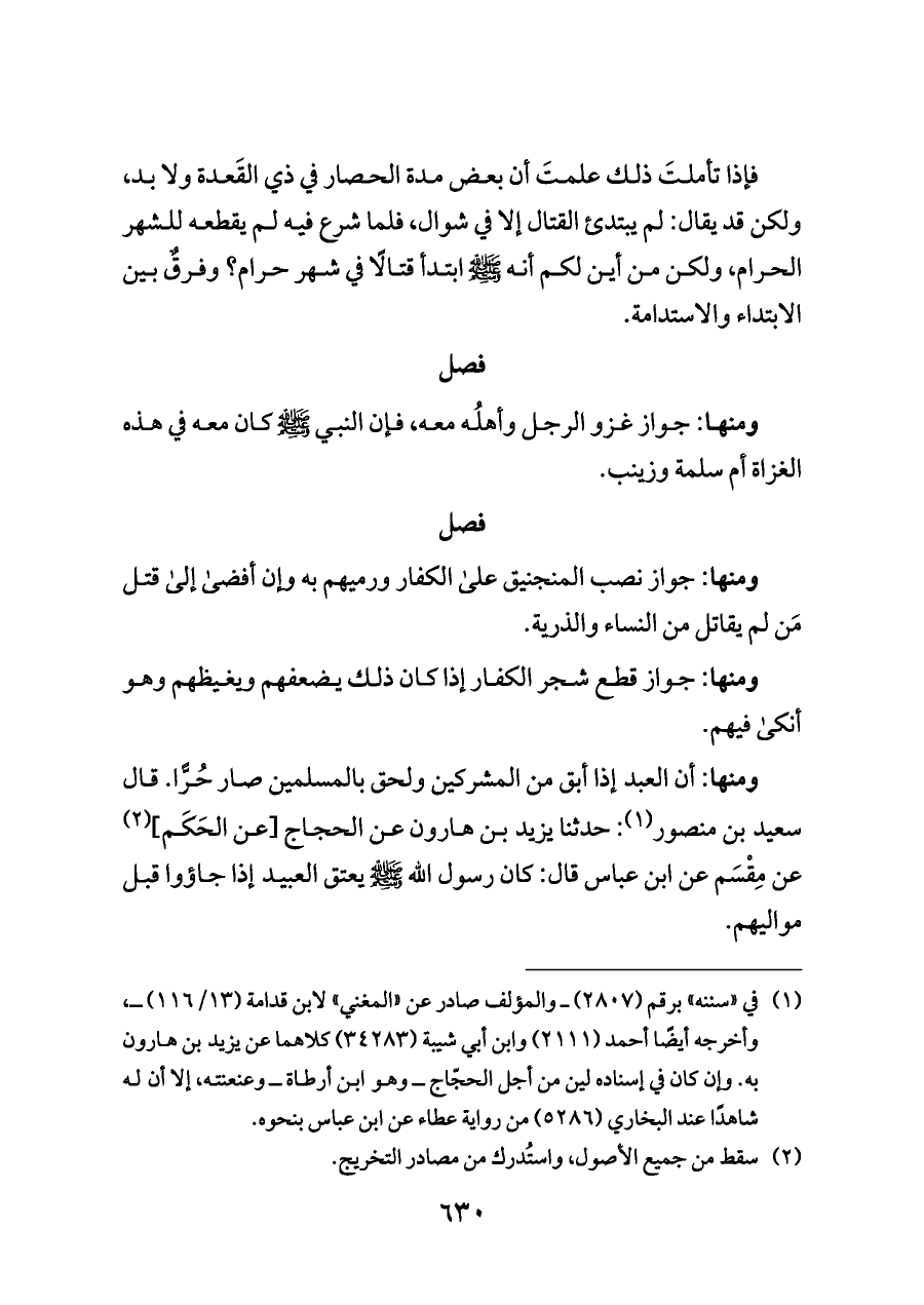 ومنها: أن العبد إذا أبق من المشركين ولحق بالمسلمين صار حُرًّا. قال سعيد بن منصور (¬١): حدثنا يزيد بن هارون عن الحجاج [عن الحَكَم] (¬٢) عن مِقْسَم عن ابن عباس قال: كان رسول الله - صلى الله عليه وسلم - يعتق العبيد إذا جاؤوا قبل مواليهم.