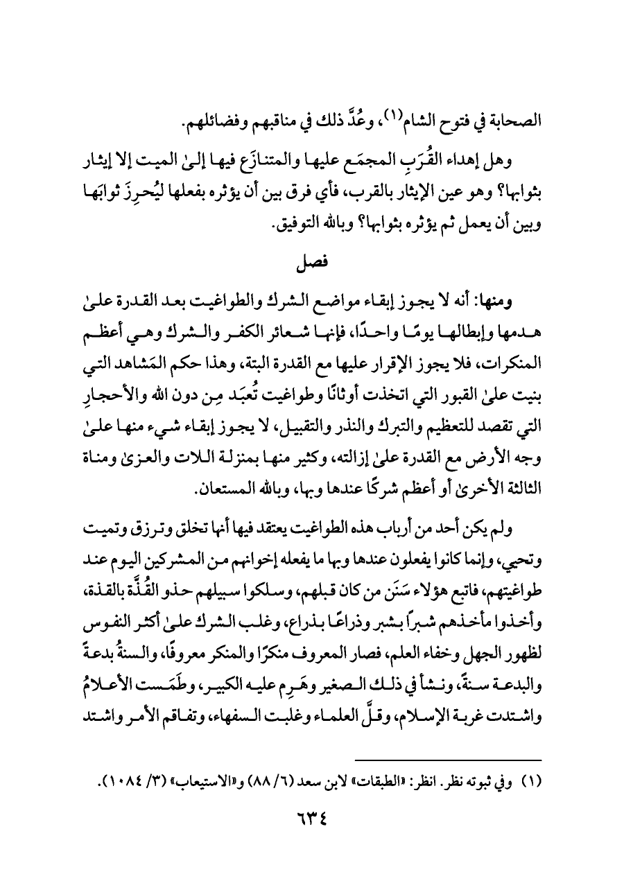 ومنها: أنه لا يجوز إبقاء مواضع الشرك والطواغيت بعد القدرة على هدمها وإبطالها يومًا واحدًا، فإنها شعائر الكفر والشرك وهي أعظم المنكرات، فلا يجوز الإقرار عليها مع القدرة البتة، وهذا حكم المَشاهد التي بنيت على القبور التي اتخذت أوثانًا وطواغيت تُعبَد مِن دون الله والأحجارِ التي تقصد للتعظيم والتبرك والنذر والتقبيل، لا يجوز إبقاء شيء منها على وجه الأرض مع القدرة على إزالته، وكثير منها بمنزلة اللات والعزى ومناة الثالثة الأخرى أو أعظم شركًا عندها وبها، وبالله المستعان.