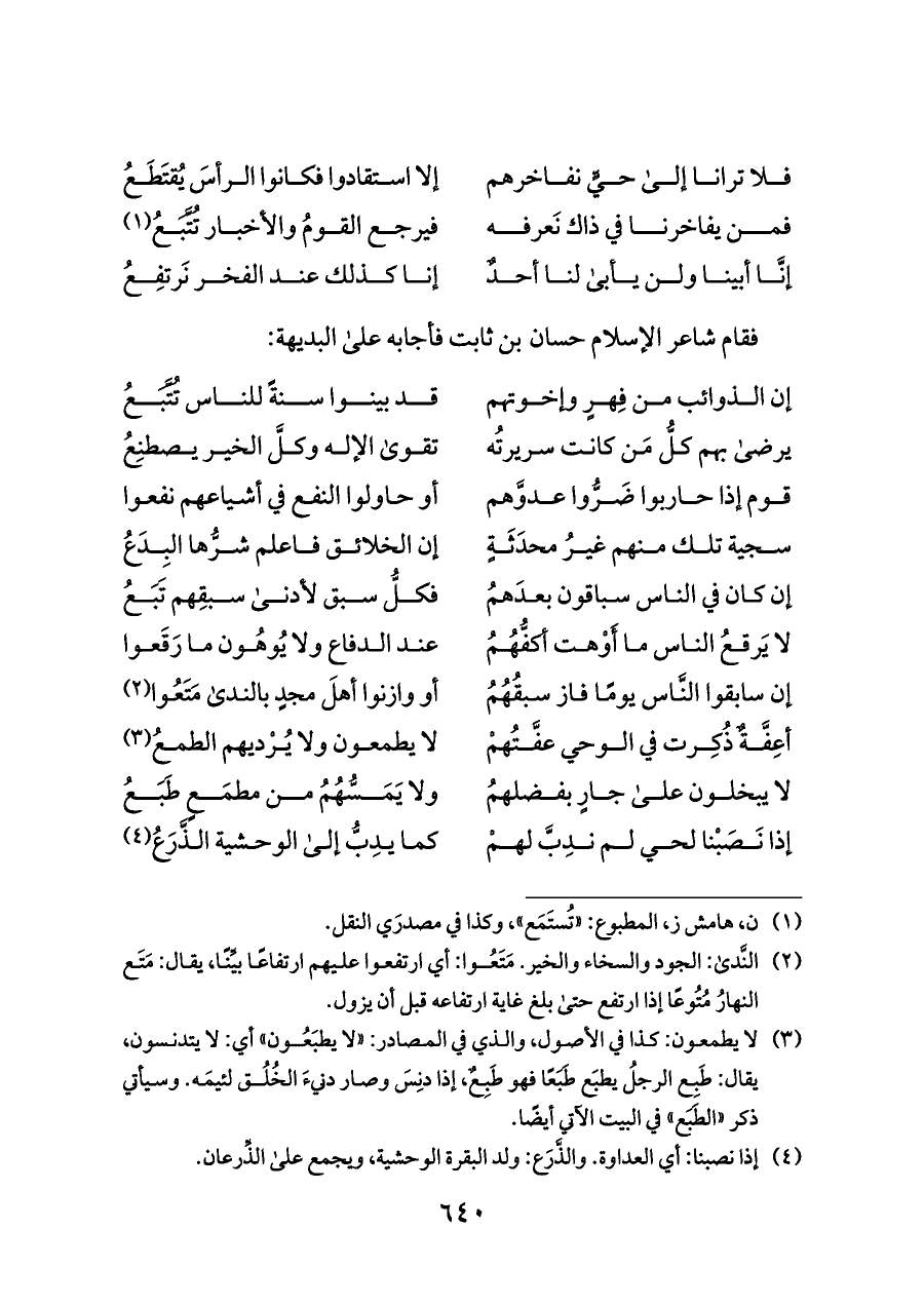 (¬٣) لا يطمعون: كذا في الأصول، والذي في المصادر: «لا يطبَعُون» أي: لا يتدنسون، يقال: طَبِع الرجلُ يطبَع طَبَعًا فهو طَبِعٌ، إذا دنِسَ وصار دنيءَ الخُلُق لئيمَه. وسيأتي ذكر «الطَبَع» في البيت الآتي أيضًا.