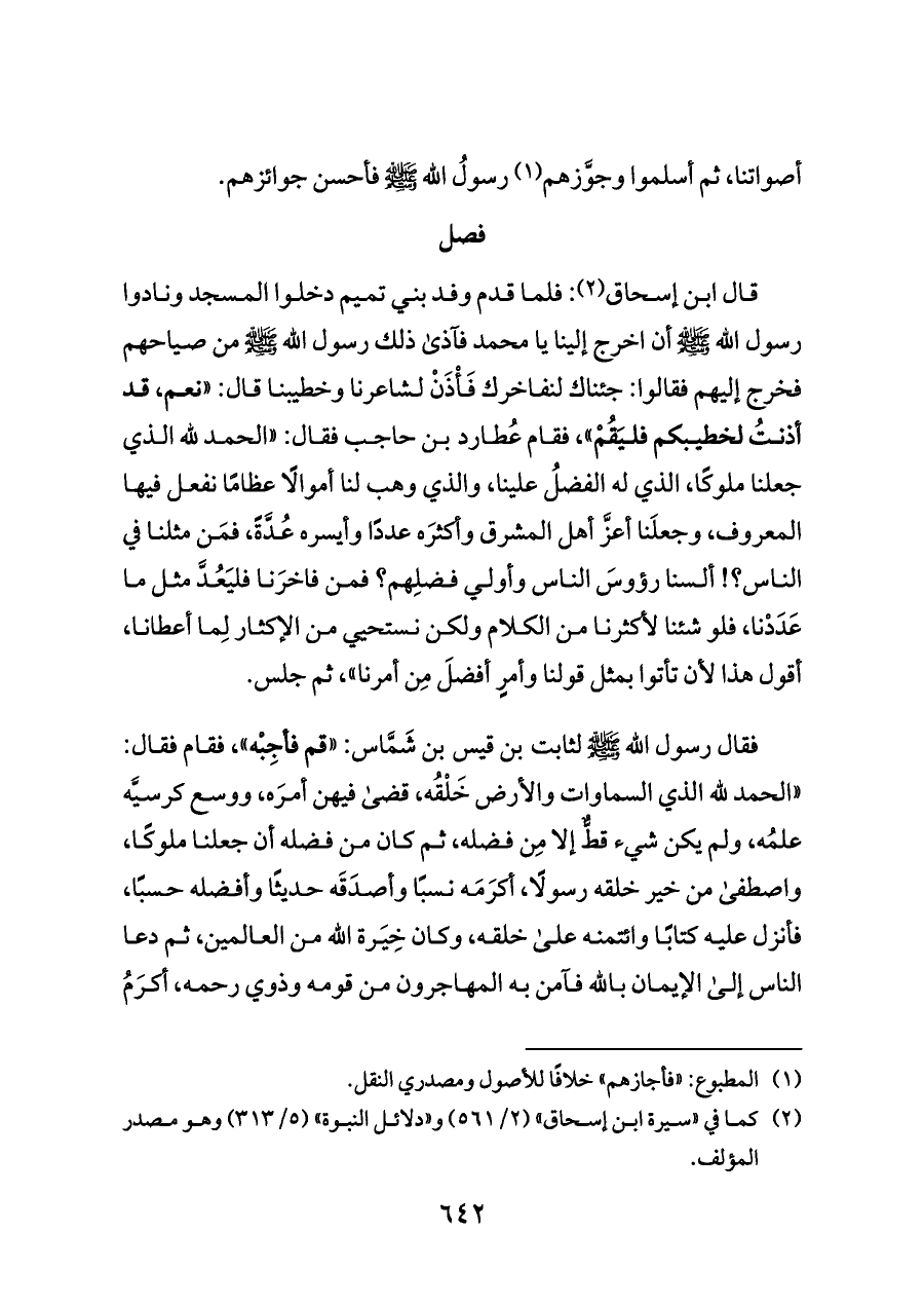 فقال رسول الله - صلى الله عليه وسلم - لثابت بن قيس بن شَمَّاس: «قم فأجِبْه»، فقام فقال: «الحمد لله الذي السماوات والأرض خَلْقُه، قضى فيهن أمرَه، ووسع كرسيَّه علمُه، ولم يكن شيء قطٌّ إلا مِن فضله، ثم كان من فضله أن جعلنا ملوكًا، واصطفى من خير خلقه رسولًا، أكرَمَه نسبًا وأصدَقَه حديثًا وأفضله حسبًا، فأنزل عليه كتابًا وائتمنه على خلقه، وكان خِيَرة الله من العالمين، ثم دعا الناس إلى الإيمان بالله فآمن به المهاجرون من قومه وذوي رحمه، أكرَمُ
