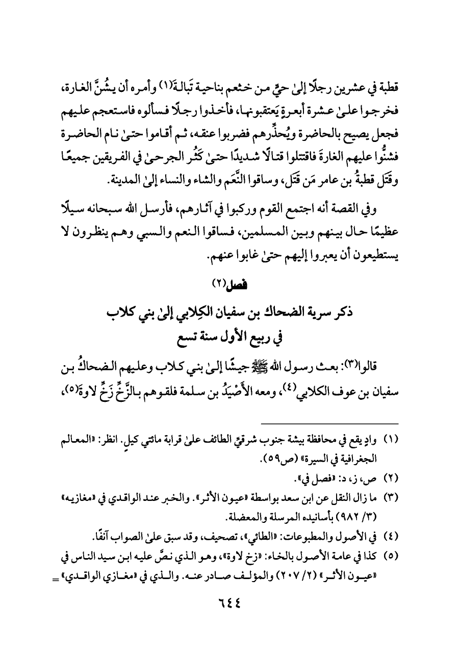 (¬٥) كذا في عامة الأصول بالخاء: «زخ لاوة»، وهو الذي نصَّ عليه ابن سيد الناس في «عيون الأثر» (٢/ ٢٠٧) والمؤلف صادر عنه. والذي في «مغازي الواقدي» و «الطبقات»: «زُجُّ لاوة» بلفظ زُجِّ الرمح، وهو الذي نصَّ عليه ابن الأثير في «النهاية» وياقوت في «معجم البلدان» وغيرهما من أصحاب معاجم اللغة والبُلدان. وفي «الطبقات» (٦/ ١٩١) أن زُجَّ لاوةَ بناحية ضَريَّة. وضريّة من بلاد نجد، وهي اليوم قرية في منطقة القصيم على بعد ٤٠٠ كيلٍ من المدينة شرقًا.
