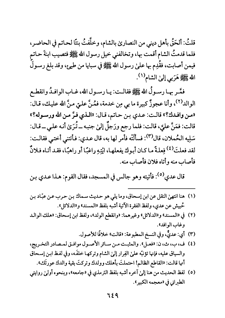 قلتُ: ألحَقُ بأهل ديني من النصارى بالشام، وخلَّفتُ بنتًا لحاتم في الحاضر، فلما قدمتُ الشام أقمت بها، وتخالفني خيل رسول الله - صلى الله عليه وسلم - فتصيب ابنةَ حاتمٍ فيمن أصابت، فقُدِم بها على رسول الله - صلى الله عليه وسلم - في سبايا من طيئ، وقد بلغ رسولَ الله - صلى الله عليه وسلم - هَرَبي إلى الشام (¬١).