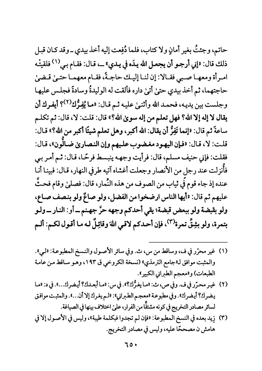 أيفرك أن يقال لا إله إلا الله؟ فهل تعلم من إله سوى الله؟» قال: قلت: لا، قال: ثم تكلم ساعةً ثم قال: «إنما تَفِرُّ أن يقال: الله أكبر، وهل تعلم شيئًا أكبر من الله؟» قال: قلت: لا، قال: «فإن اليهود مغضوب عليهم وإن النصارى ضالُّون»، قال: فقلت: فإني حنيف مسلم، قال: فرأيت وجهه ينبسط فرحًا، قال: ثم أمر بي فأُنزلت عند رجلٍ من الأنصار وجعلت أغشاه آتيه طرفي النهار، قال: فبينا أنا عنده إذ جاء قوم في ثياب من الصوف من هذه النِّمار، قال: فصلى وقام فحثَّ عليهم ثم قال: «أيها الناس ارضخوا من الفضل، ولو صاعٌ ولو بنصف صاع، ولو بقبضة ولو ببعض قبضة؛ يقي أحدكم وجهه حرَّ جهنم ــ أو: النار ــ ولو بتمرة، ولو بشِقِّ تمرة (¬٣)، فإن أحدكم لاقي اللهَ وقائِلٌ له ما أقول لكم: ألم