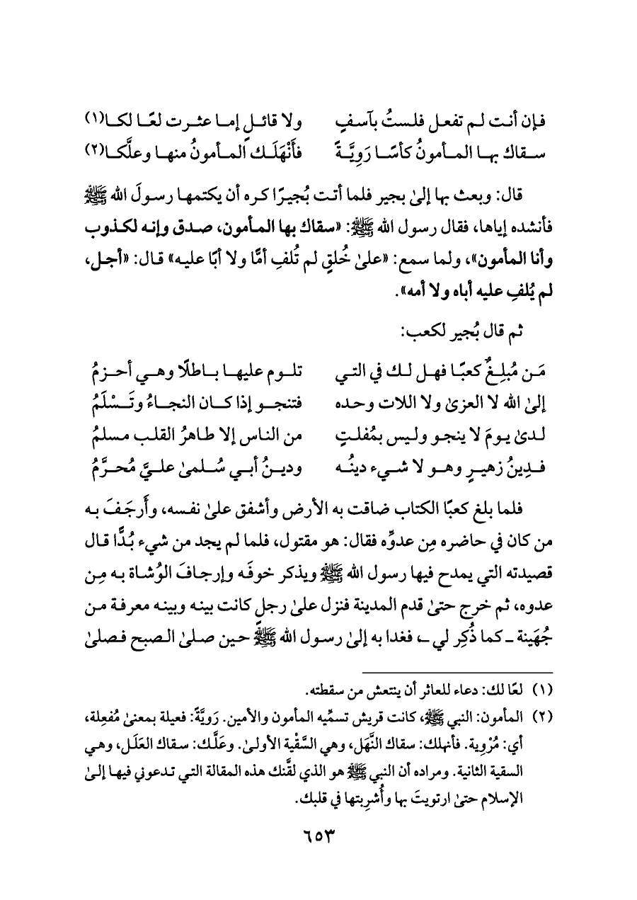 قال: وبعث بها إلى بجير فلما أتت بُجيرًا كره أن يكتمها رسولَ الله - صلى الله عليه وسلم - فأنشده إياها، فقال رسول الله - صلى الله عليه وسلم -: «سقاك بها المأمون، صدق وإنه لكذوب وأنا المأمون»، ولما سمع: «على خُلقٍ لم تُلفِ أمًّا ولا أبًا عليه» قال: «أجل، لم يُلفِ عليه أباه ولا أمه».