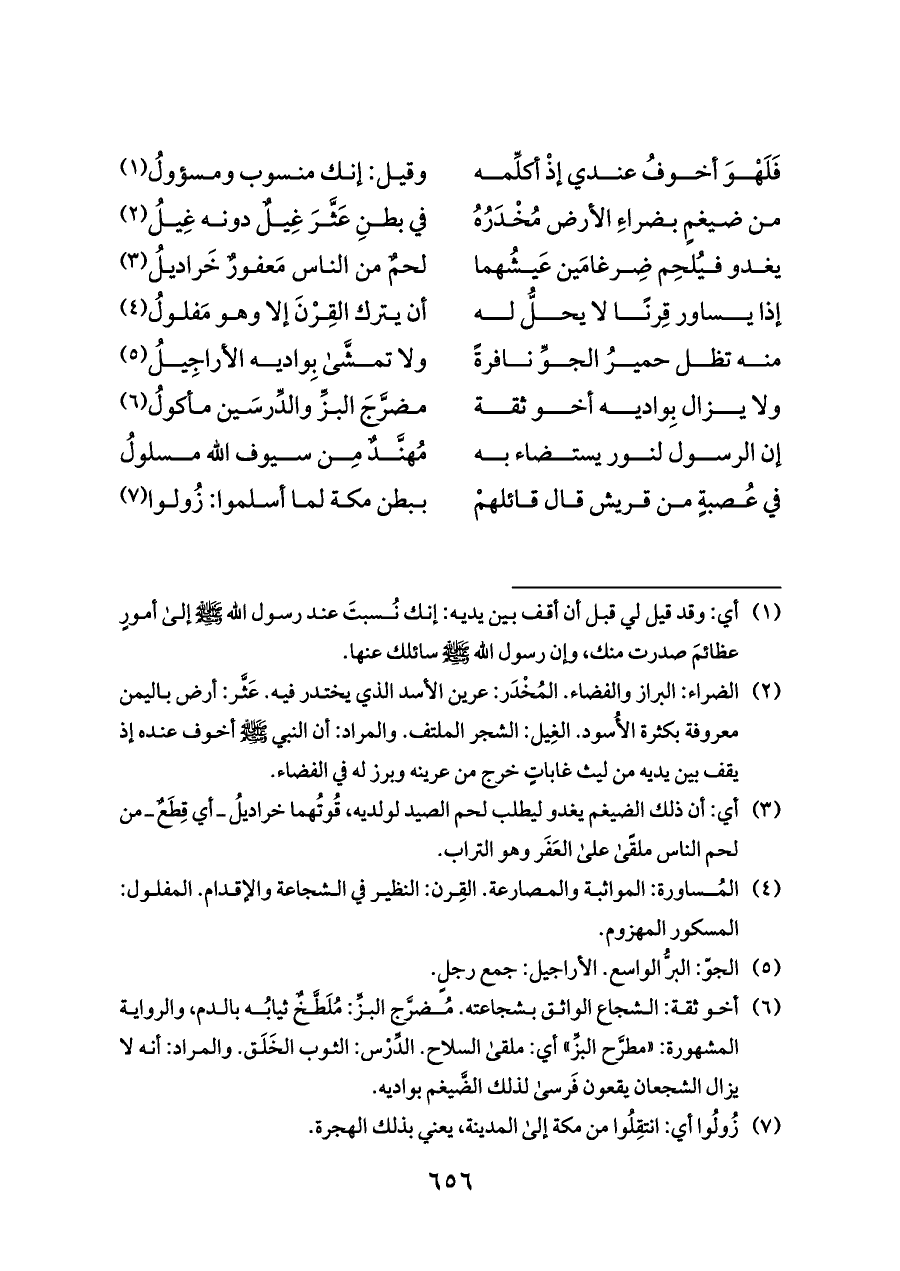 (¬٦) أخو ثقة: الشجاع الواثق بشجاعته .. مُضرَّج البزِّ: مُلَطَّخٌ ثيابُه بالدم، والرواية المشهورة: «مطرَّح البزِّ» أي: ملقى السلاح. الدِّرْس: الثوب الخَلَق. والمراد: أنه لا يزال الشجعان يقعون فَرسى لذلك الضَّيغم بواديه.
