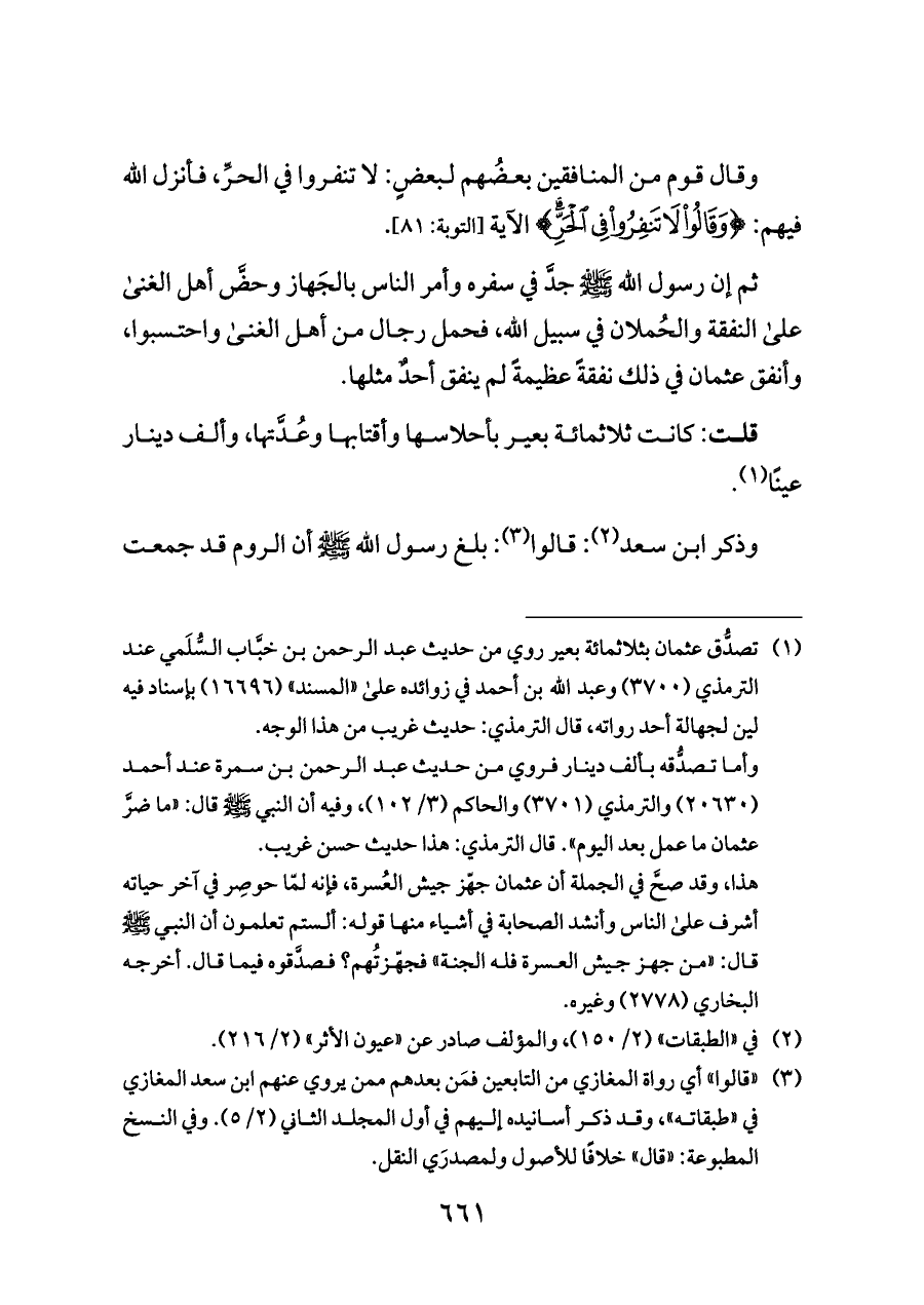 (¬١) تصدُّق عثمان بثلاثمائة بعير روي من حديث عبد الرحمن بن خبَّاب السُّلَمي عند الترمذي (٣٧٠٠) وعبد الله بن أحمد في زوائده على «المسند» (١٦٦٩٦) بإسناد فيه لين لجهالة أحد رواته، قال الترمذي: حديث غريب من هذا الوجه.