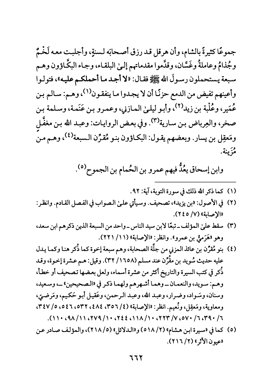 جموعًا كثيرةً بالشام، وأن هرقل قد رزق أصحابَه لسنةٍ، وأجلبت معه لَخْمٌ وجُذامُ وعاملةُ وغَسَّان، وقدَّموا مقدماتهم إلى البلقاء، وجاء البكَّاؤون وهم سبعة يستحملون رسولَ الله - صلى الله عليه وسلم - فقال: «لا أجد ما أحملكم عليه»، فتولوا وأعينهم تفيض من الدمع حزنًا أن لا يجدوا ما ينفقون (¬١)، وهم: سالم بن عُمَير، وعُلْبة بن زيد (¬٢)، وأبو ليلى المازني، وعمرو بن عَنَمة، وسلمة بن صخر، والعِرباض بن سارية (¬٣). وفي بعض الروايات: وعبد الله بن مغفَّلٍ ومَعقِل بن يسار. وبعضهم يقول: البكاؤون بنو مُقرِّن السبعة (¬٤)،