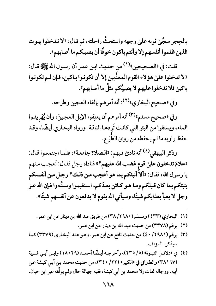 بالحِجر سجَّى ثوبه على وجهه واستحثَّ راحلته، ثم قال: «لا تدخلوا بيوت الذين ظلموا أنفسهم إلا وأنتم باكون خوفًا أن يصيبكم ما أصابهم».