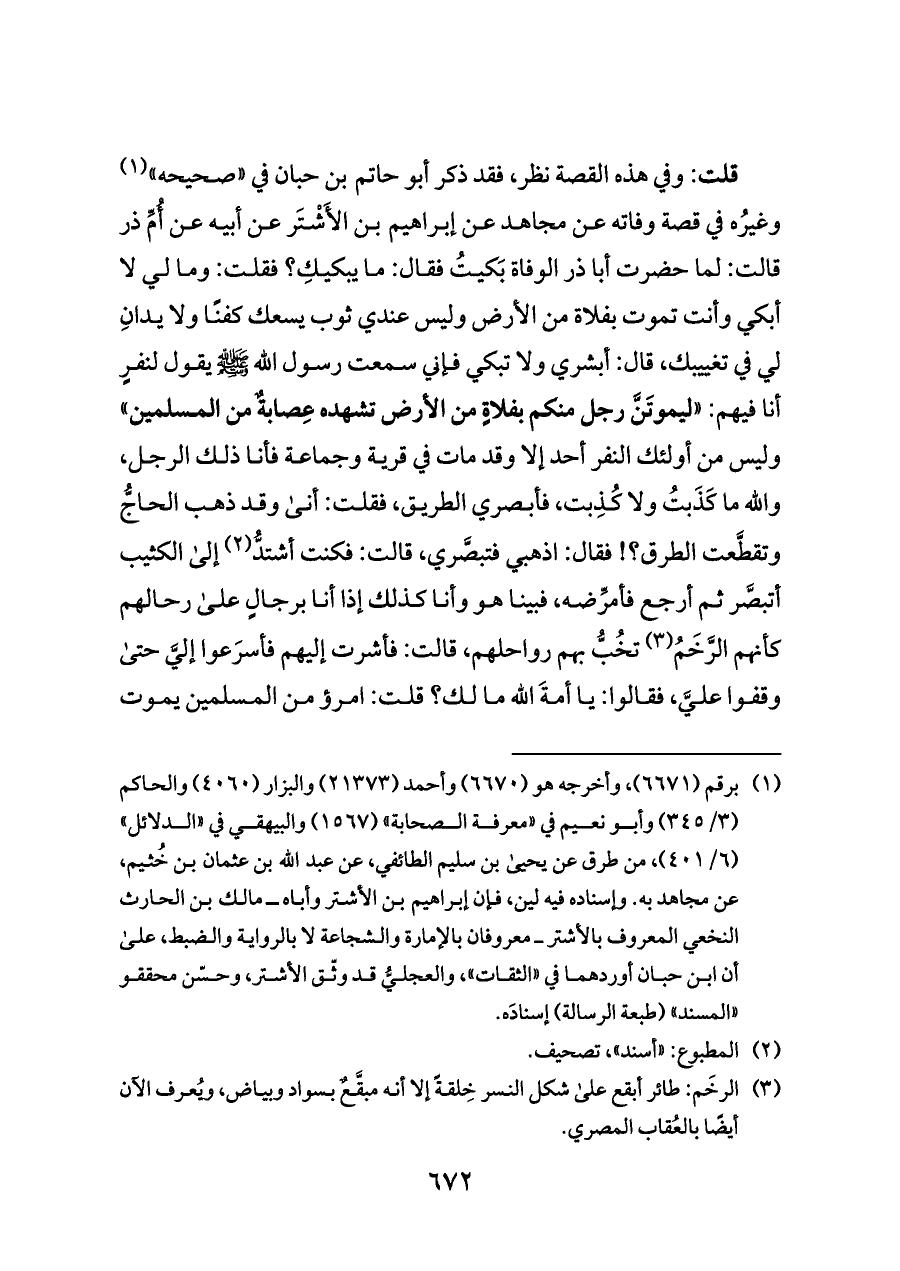 قلت: وفي هذه القصة نظر، فقد ذكر أبو حاتم بن حبان في «صحيحه» (¬١) وغيرُه في قصة وفاته عن مجاهد عن إبراهيم بن الأَشْتَر عن أبيه عن أُمِّ ذر قالت: لما حضرت أبا ذر الوفاة بَكيتُ فقال: ما يبكيكِ؟ فقلت: وما لي لا أبكي وأنت تموت بفلاة من الأرض وليس عندي ثوب يسعك كفنًا ولا يدانِ لي في تغييبك، قال: أبشري ولا تبكي فإني سمعت رسول الله - صلى الله عليه وسلم - يقول لنفرٍ أنا فيهم: «ليموتَنَّ رجل منكم بفلاةٍ من الأرض تشهده عِصابةٌ من المسلمين» وليس من أولئك النفر أحد إلا وقد مات في قرية وجماعة فأنا ذلك الرجل، والله ما كَذَبتُ ولا كُذِبت، فأبصري الطريق، فقلت: أنى وقد ذهب الحاجُّ وتقطَّعت الطرق؟! فقال: اذهبي فتبصَّري، قالت: فكنت أشتدُّ (¬٢) إلى الكثيب أتبصَّر ثم أرجع فأمرِّضه، فبينا هو وأنا كذلك إذا أنا برجالٍ على رحالهم كأنهم الرَّخَمُ (¬٣)