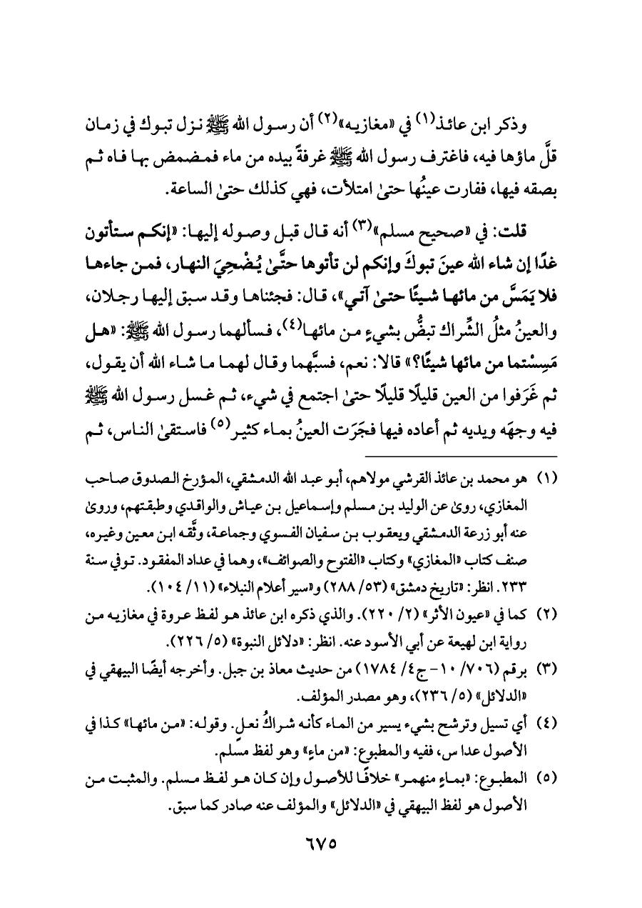 قلت: في «صحيح مسلم» (¬٣) أنه قال قبل وصوله إليها: «إنكم ستأتون غدًا إن شاء الله عينَ تبوكَ وإنكم لن تأتوها حتَّى يُضْحِيَ النهار، فمن جاءها فلا يَمَسَّ من مائها شيئًا حتى آتي»، قال: فجئناها وقد سبق إليها رجلان، والعينُ مثلُ الشِّراك تبضُّ بشيءٍ من مائها (¬٤)، فسألهما رسول الله - صلى الله عليه وسلم -: «هل مَسِسْتما من مائها شيئًا؟» قالا: نعم، فسبَّهما وقال لهما ما شاء الله أن يقول، ثم غَرَفوا من العين قليلًا قليلًا حتى اجتمع في شيء، ثم غسل رسول الله - صلى الله عليه وسلم - فيه وجهَه ويديه ثم أعاده فيها فجَرَت العينُ بماء كثير (¬٥) فاستقى الناس، ثم