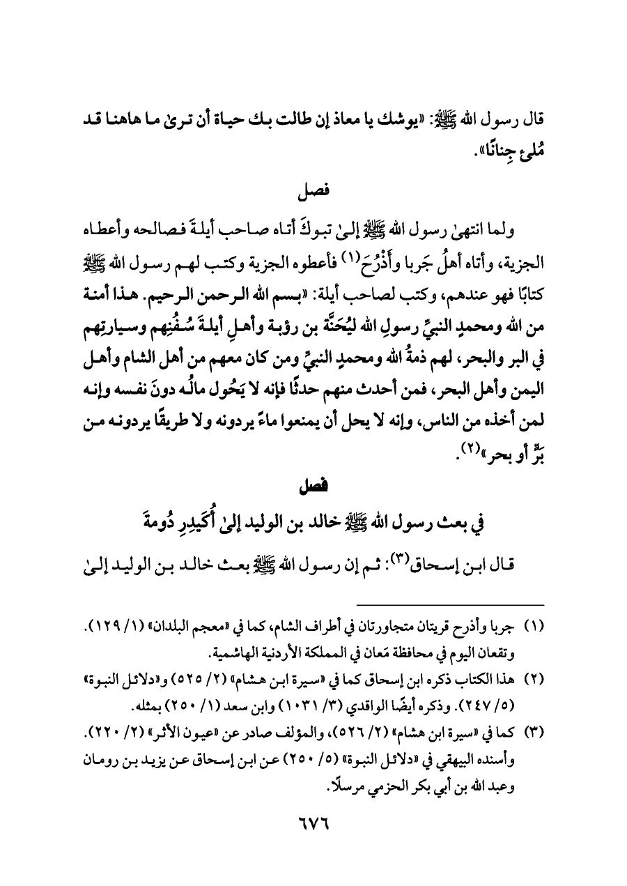 ولما انتهى رسول الله - صلى الله عليه وسلم - إلى تبوكَ أتاه صاحب أيلةَ فصالحه وأعطاه الجزية، وأتاه أهلُ جَربا وأَذْرُحَ (¬١) فأعطوه الجزية وكتب لهم رسول الله - صلى الله عليه وسلم - كتابًا فهو عندهم، وكتب لصاحب أيلة: «بسم الله الرحمن الرحيم. هذا أمنة من الله ومحمدٍ النبيِّ رسولِ الله ليُحَنَّة بن رؤبة وأهلِ أيلةَ سُفُنِهم وسيارتِهم في البر والبحر، لهم ذمةُ الله ومحمدٍ النبيِّ ومن كان معهم من أهل الشام وأهل اليمن وأهل البحر، فمن أحدث منهم حدثًا فإنه لا يَحُول مالُه دونَ نفسه وإنه لمن أخذه من الناس، وإنه لا يحل أن يمنعوا ماءً يردونه ولا طريقًا يردونه من بَرٍّ أو بحر» (¬٢).