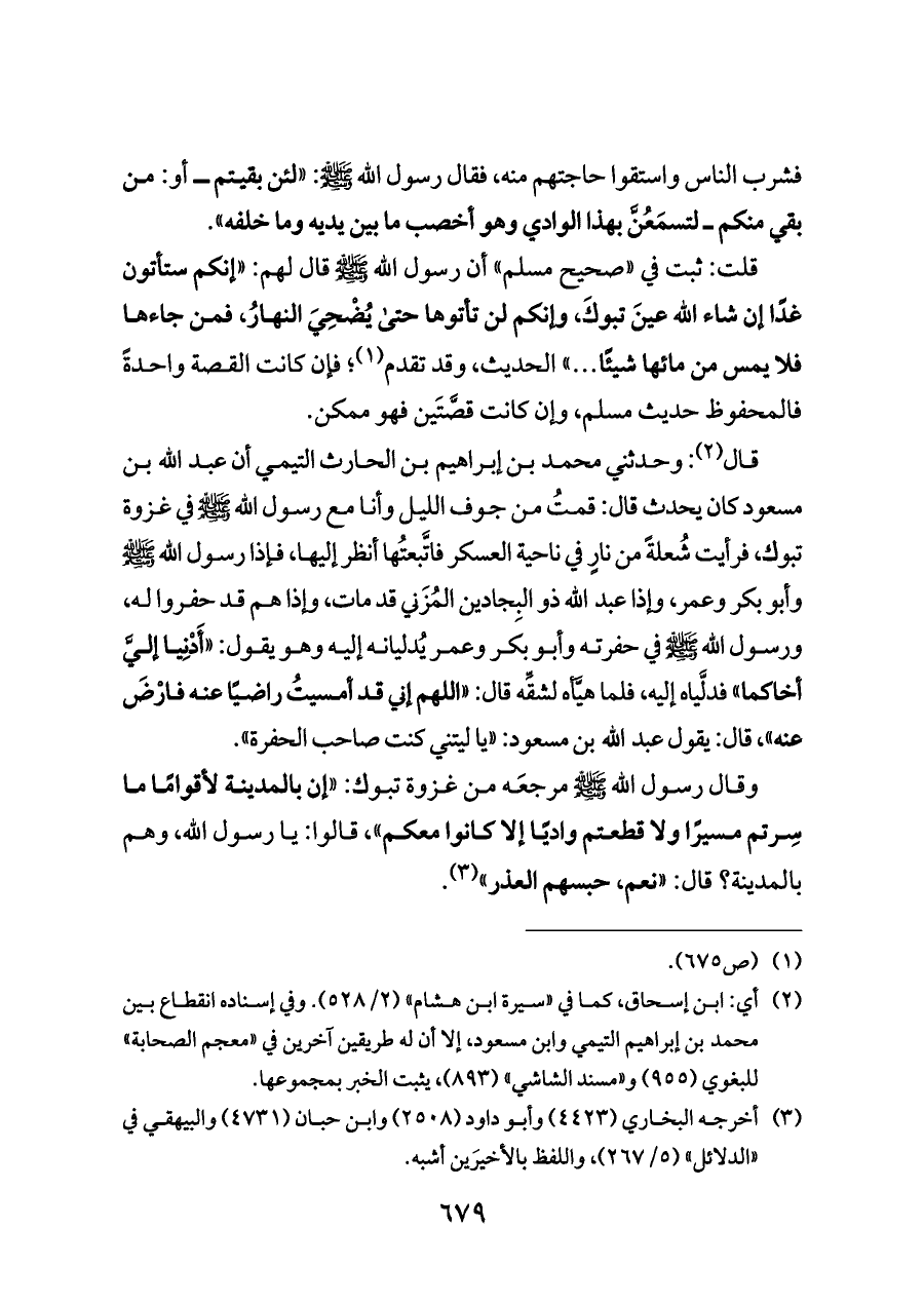 قلت: ثبت في «صحيح مسلم» أن رسول الله - صلى الله عليه وسلم - قال لهم: «إنكم ستأتون غدًا إن شاء الله عينَ تبوكَ، وإنكم لن تأتوها حتى يُضْحِيَ النهارُ، فمن جاءها فلا يمس من مائها شيئًا ... » الحديث، وقد تقدم (¬١)؛ فإن كانت القصة واحدةً فالمحفوظ حديث مسلم، وإن كانت قصَّتَين فهو ممكن.