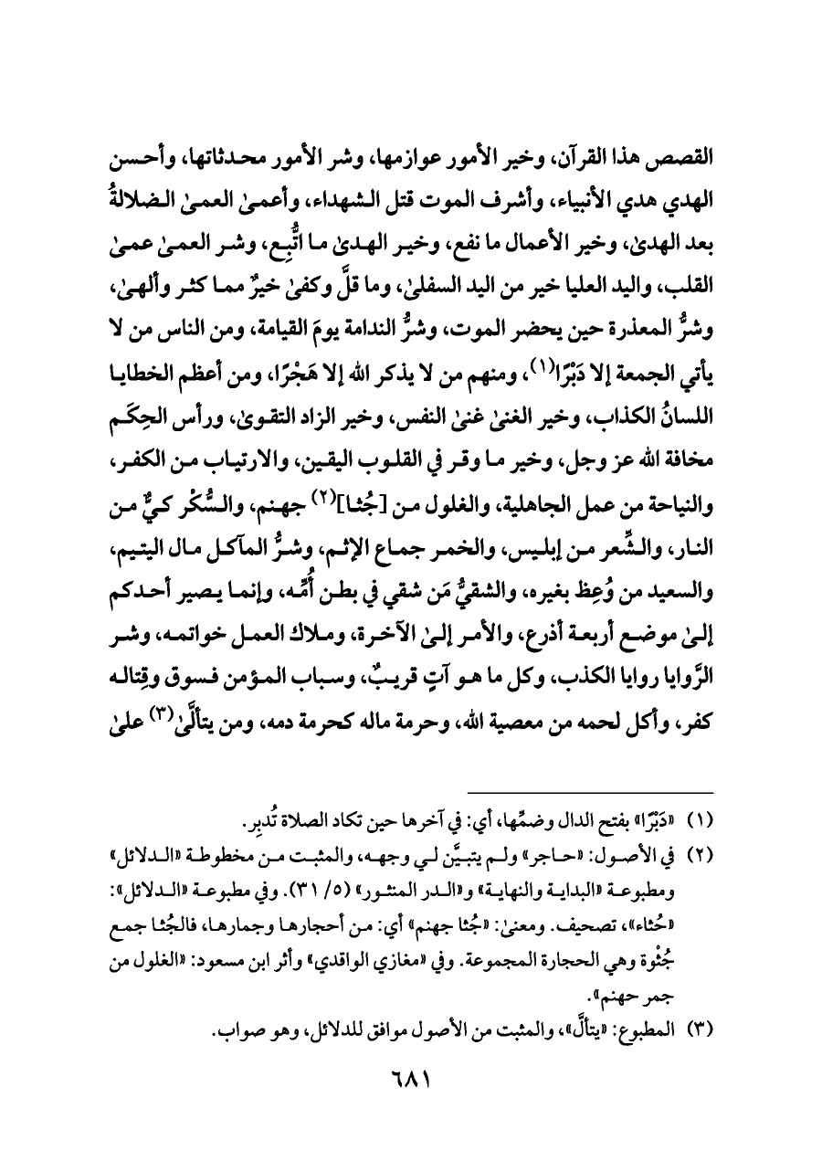 القصص هذا القرآن، وخير الأمور عوازمها، وشر الأمور محدثاتها، وأحسن الهدي هدي الأنبياء، وأشرف الموت قتل الشهداء، وأعمى العمى الضلالةُ بعد الهدى، وخير الأعمال ما نفع، وخير الهدى ما اتُّبِع، وشر العمى عمى القلب، واليد العليا خير من اليد السفلى، وما قلَّ وكفى خيرٌ مما كثر وألهى، وشرُّ المعذرة حين يحضر الموت، وشرُّ الندامة يومَ القيامة، ومن الناس من لا يأتي الجمعة إلا دَبْرًا (¬١)، ومنهم من لا يذكر الله إلا هَجْرًا، ومن أعظم الخطايا اللسانُ الكذاب، وخير الغنى غنى النفس، وخير الزاد التقوى، ورأس الحِكَم مخافة الله عز وجل، وخير ما وقر في القلوب اليقين، والارتياب من الكفر، والنياحة من عمل الجاهلية، والغلول من [جُثا] (¬٢)