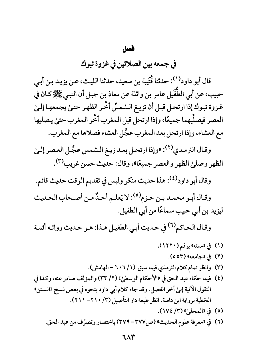 قال أبو داود (¬١): حدثنا قُتَيبة بن سعيد، حدثنا الليث، عن يزيد بن أبي حبيب، عن أبي الطُّفَيل عامر بن واثلة عن معاذ بن جبل أن النبي - صلى الله عليه وسلم - كان في غزوة تبوك إذا ارتحل قبل أن تزيغ الشمسُ أخَّر الظهر حتى يجمعها إلى العصر فيصلِّيهما جميعًا، وإذا ارتحل قبل المغرب أخَّر المغرب حتى يصليها مع العشاء، وإذا ارتحل بعد المغرب عجَّل العشاء فصلاها مع المغرب.