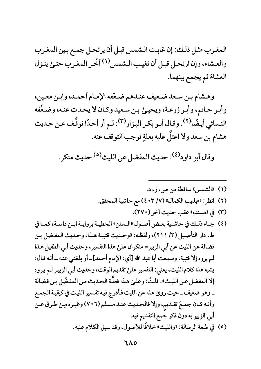 (¬٤) جاء ذلك في حاشية بعض أصول «السنن» الخطية برواية ابن داسة، كما في ط. دار التأصيل (٣/ ٢١١)، ولفظه: «وحديث قتيبة هذا، وحديث المفضل بن فضالة عن الليث عن أبي الزبير= منكران على هذا التفسير، وحديث أبي الطفيل هذا لم يروه إلا قتيبة، وسمعت أبا عبد الله [أي: الإمام أحمد]ــ أو بلغني عنه ــ أنه قال: يشبه هذا كلام الليث، يعني: التفسير على تقديم الوقت، وحديث أبي الزبير لم يروه إلا المفضل عن الليث». قلتُ: وعلى هذا فعلَّة الحديث من المفضّل بن فضالة ــ وهو ضعيف ــ حيث روى هذا عن الليث فأدرج فيه تفسير الليث في كيفية الجمع وأنه كان جمعَ تقديمٍ، وإلا فالحديث عند مسلم (٧٠٦) وغيره مِن طرق عن أبي الزبير به دون ذكر جمع التقديم فيه.