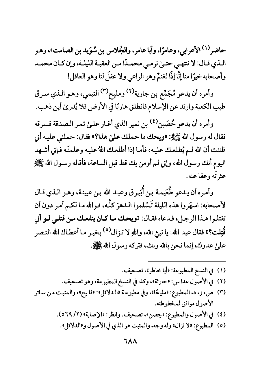 وأمره أن يدعو حُصَين (¬٤) بن نمير الذي أغار على تمر الصدقة فسرقه فقال له رسول الله - صلى الله عليه وسلم -: «ويحك ما حملك على هذا؟» فقال: حملني عليه أني ظننت أن الله لم يُطلعك عليه، فأما إذا أطلعك اللهُ عليه وعلمتَه فإني أشهد اليوم أنك رسول الله، وإني لم أومن بك قط قبل الساعة، فأقاله رسول الله - صلى الله عليه وسلم - عثرتَه وعفا عنه.