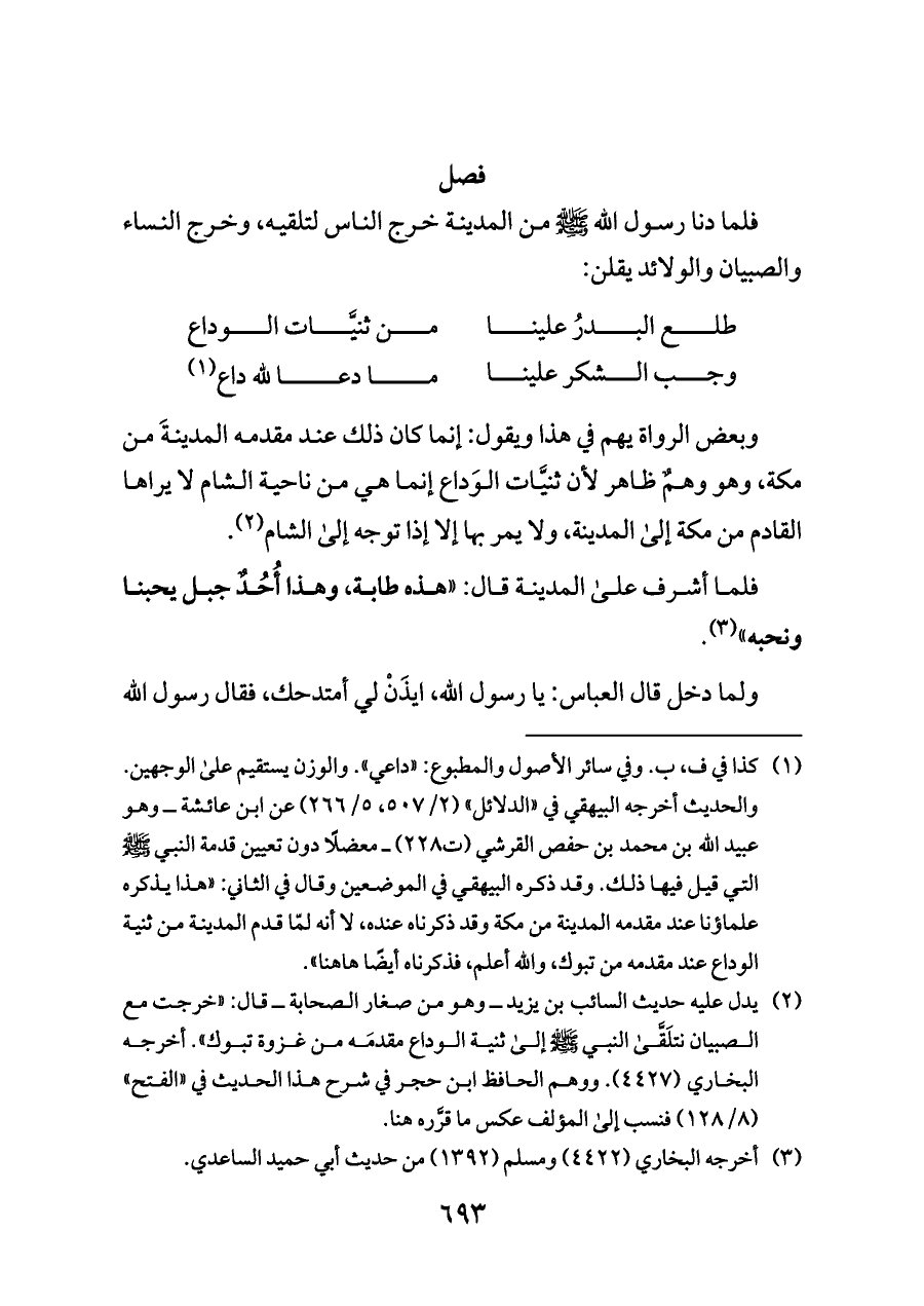وبعض الرواة يهم في هذا ويقول: إنما كان ذلك عند مقدمه المدينةَ من مكة، وهو وهمٌ ظاهر لأن ثنيَّات الوَداع إنما هي من ناحية الشام لا يراها القادم من مكة إلى المدينة، ولا يمر بها إلا إذا توجه إلى الشام (¬٢).