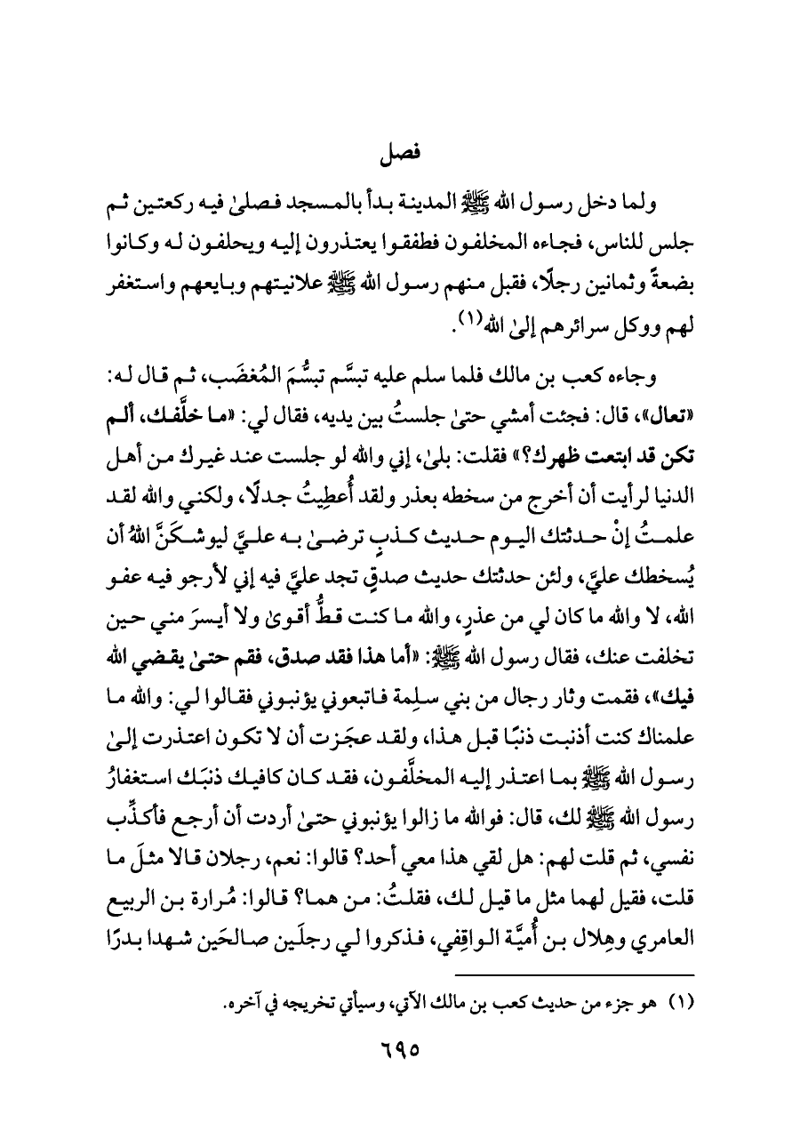 وجاءه كعب بن مالك فلما سلم عليه تبسَّم تبسُّمَ المُغضَب، ثم قال له: «تعال»، قال: فجئت أمشي حتى جلستُ بين يديه، فقال لي: «ما خلَّفك، ألم تكن قد ابتعت ظهرك؟» فقلت: بلى، إني والله لو جلست عند غيرك من أهل الدنيا لرأيت أن أخرج من سخطه بعذر ولقد أُعطِيتُ جدلًا، ولكني والله لقد علمتُ إنْ حدثتك اليوم حديث كذبٍ ترضى به عليَّ ليوشكَنَّ اللهُ أن يُسخطك عليَّ، ولئن حدثتك حديث صدقٍ تجد عليَّ فيه إني لأرجو فيه عفو الله، لا والله ما كان لي من عذرٍ، والله ما كنت قطُّ أقوى ولا أيسرَ مني حين تخلفت عنك، فقال رسول الله - صلى الله عليه وسلم -: «أما هذا فقد صدق، فقم حتى يقضي الله فيك»، فقمت وثار رجال من بني سلِمة فاتبعوني يؤنبوني فقالوا لي: والله ما علمناك كنت أذنبت ذنبًا قبل هذا، ولقد عجَزت أن لا تكون اعتذرت إلى رسول الله - صلى الله عليه وسلم - بما اعتذر إليه المخلَّفون، فقد كان كافيك ذنبَك استغفارُ رسول الله - صلى الله عليه وسلم - لك، قال: فوالله ما زالوا يؤنبوني حتى أردت أن أرجع فأكذِّب نفسي، ثم قلت لهم: هل لقي هذا معي أحد؟ قالوا: نعم، رجلان قالا مثلَ ما قلت، فقيل لهما مثل ما قيل لك، فقلتُ: من هما؟ قالوا: مُرارة بن الربيع العامري وهِلال بن أُميَّة الواقِفي، فذكروا لي رجلَين صالحَين شهدا بدرًا