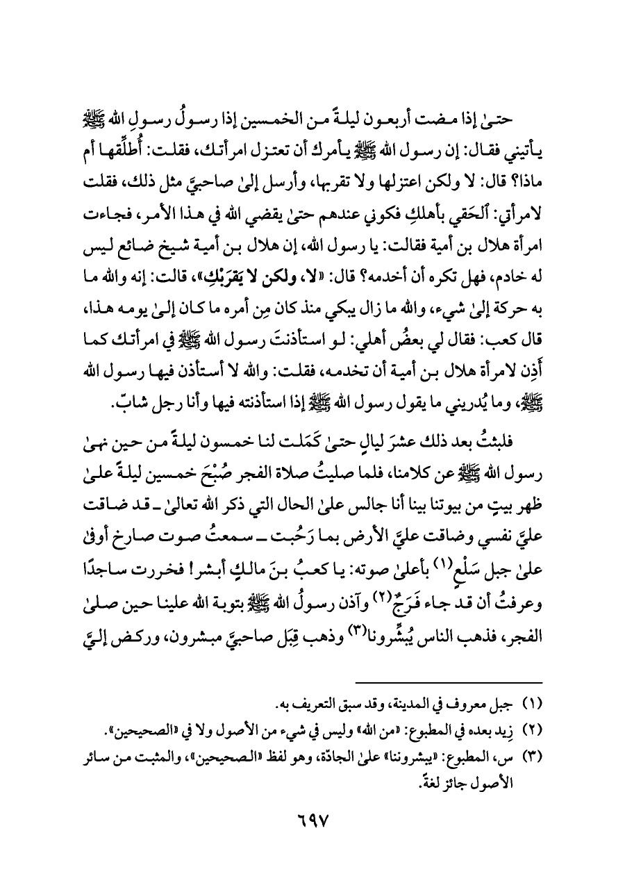 حتى إذا مضت أربعون ليلةً من الخمسين إذا رسولُ رسولِ الله - صلى الله عليه وسلم - يأتيني فقال: إن رسول الله - صلى الله عليه وسلم - يأمرك أن تعتزل امرأتك، فقلت: أُطلِّقها أم ماذا؟ قال: لا ولكن اعتزلها ولا تقربها، وأرسل إلى صاحبيَّ مثل ذلك، فقلت لامرأتي: الحَقي بأهلكِ فكوني عندهم حتى يقضي الله في هذا الأمر، فجاءت امرأة هلال بن أمية فقالت: يا رسول الله، إن هلال بن أمية شيخ ضائع ليس له خادم، فهل تكره أن أخدمه؟ قال: «لا، ولكن لا يَقرَبْكِ»، قالت: إنه والله ما به حركة إلى شيء، والله ما زال يبكي منذ كان مِن أمره ما كان إلى يومه هذا، قال كعب: فقال لي بعضُ أهلي: لو استأذنتَ رسول الله - صلى الله عليه وسلم - في امرأتك كما أَذِن لامرأة هلال بن أمية أن تخدمه، فقلت: والله لا أستأذن فيها رسول الله - صلى الله عليه وسلم -، وما يُدريني ما يقول رسول الله - صلى الله عليه وسلم - إذا استأذنته فيها وأنا رجل شابّ.