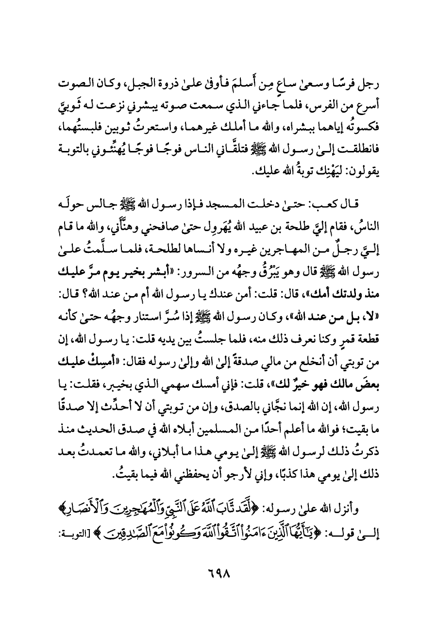 قال كعب: حتى دخلت المسجد فإذا رسول الله - صلى الله عليه وسلم - جالس حولَه الناسُ، فقام إليَّ طلحة بن عبيد الله يُهَروِل حتى صافحني وهنَّأَني، والله ما قام إليَّ رجلٌ من المهاجرين غيره ولا أنساها لطلحة، فلما سلَّمتُ على رسول الله - صلى الله عليه وسلم - قال وهو يَبْرُقُ وجهُه من السرور: «أبشر بخير يوم مرَّ عليك منذ ولدتك أمك»، قال: قلت: أمن عندك يا رسول الله أم من عند الله؟ قال: «لا، بل من عند الله»، وكان رسول الله - صلى الله عليه وسلم - إذا سُرَّ استنار وجهُه حتى كأنه قطعة قمرٍ وكنا نعرف ذلك منه، فلما جلستُ بين يديه قلت: يا رسول الله، إن من توبتي أن أنخلع من مالي صدقةً إلى الله وإلى رسوله فقال: «أمسِكْ عليك بعضَ مالك فهو خيرٌ لك»، قلت: فإني أمسك سهمي الذي بخيبر، فقلت: يا رسول الله، إن الله إنما نجَّاني بالصدق، وإن من توبتي أن لا أحدِّث إلا صدقًا ما بقيت؛ فوالله ما أعلم أحدًا من المسلمين أبلاه الله في صدق الحديث منذ ذكرتُ ذلك لرسول الله - صلى الله عليه وسلم - إلى يومي هذا ما أبلاني، والله ما تعمدتُ بعد ذلك إلى يومي هذا كذبًا، وإني لأرجو أن يحفظني الله فيما بقيتُ.