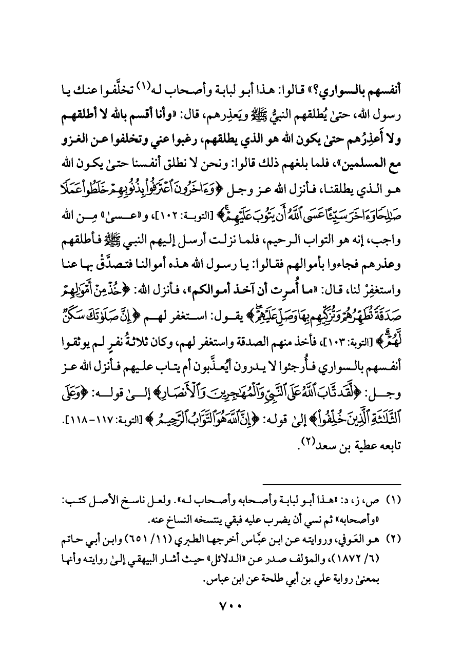 تخلَّفوا عنك يا رسول الله، حتى يُطلقهم النبيُّ - صلى الله عليه وسلم - ويَعذِرهم، قال: «وأنا أقسم بالله لا أطلقهم ولا أَعذِرُهم حتى يكون الله هو الذي يطلقهم، رغبوا عني وتخلفوا عن الغزو مع المسلمين»، فلما بلغهم ذلك قالوا: ونحن لا نطلق أنفسنا حتى يكون الله هو الذي يطلقنا، فأنزل الله عز وجل {(١٠١) وَآخَرُونَ اعْتَرَفُوا بِذُنُوبِهِمْ خَلَطُوا عَمَلًا صَالِحًا وَآخَرَ سَيِّئًا عَسَى اللَّهُ أَنْ يَتُوبَ عَلَيْهِمْ} [التوبة: ١٠٢]، و «عسى» مِن الله واجب، إنه هو التواب الرحيم، فلما نزلت أرسل إليهم النبي - صلى الله عليه وسلم - فأطلقهم وعذرهم فجاءوا بأموالهم فقالوا: يا رسول الله هذه أموالنا فتصدَّقْ بها عنا واستغفِرْ لنا، قال: «ما أُمرِت أن آخذ أموالكم»، فأنزل الله: {(١٠٢) خُذْ مِنْ أَمْوَالِهِمْ صَدَقَةً تُطَهِّرُهُمْ وَتُزَكِّيهِمْ بِهَا وَصَلِّ عَلَيْهِمْ} يقول: استغفر لهم {إِنَّ صَلَاتَكَ سَكَنٌ لَهُمْ} [التوبة: ١٠٣]، فأخذ منهم الصدقة واستغفر لهم، وكان ثلاثةُ نفرٍ لم يوثقوا أنفسهم بالسواري فأُرجئوا لا يدرون أيُعذَّبون أم يتاب عليهم فأنزل الله عز وجل: {لَقَدْ تَابَ اللَّهُ عَلَى النَّبِيِّ وَالْمُهَاجِرِينَ وَالْأَنْصَارِ} إلى قوله: {وَعَلَى الثَّلَاثَةِ الَّذِينَ خُلِّفُوا} إلى قوله: {إِنَّ اللَّهَ هُوَ التَّوَّابُ الرَّحِيمُ} [التوبة: ١١٧ - ١١٨]. تابعه عطية بن سعد (¬٢).
