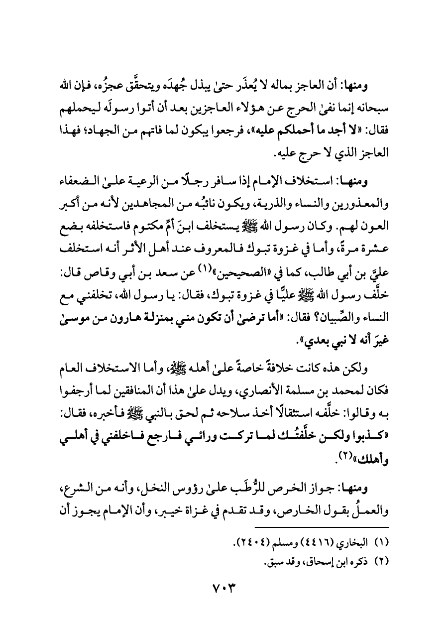 ومنها: استخلاف الإمام إذا سافر رجلًا من الرعية على الضعفاء والمعذورين والنساء والذرية، ويكون نائبُه من المجاهدين لأنه من أكبر العون لهم. وكان رسول الله - صلى الله عليه وسلم - يستخلف ابنَ أمِّ مكتوم فاستخلفه بضع عشرة مرةً، وأما في غزوة تبوك فالمعروف عند أهل الأثر أنه استخلف عليَّ بن أبي طالب، كما في «الصحيحين» (¬١) عن سعد بن أبي وقاص قال: خلَّف رسول الله - صلى الله عليه وسلم - عليًّا في غزوة تبوك، فقال: يا رسول الله، تخلفني مع النساء والصِّبيان؟ فقال: «أما ترضى أن تكون مني بمنزلة هارون من موسى غيرَ أنه لا نبي بعدي».
