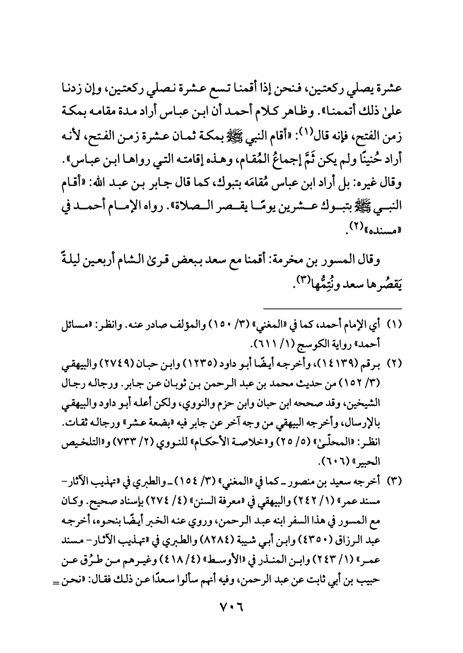 (¬٣) أخرجه سعيد بن منصور ــ كما في «المغني» (٣/ ١٥٤) ــ والطبري في «تهذيب الآثار- مسند عمر» (١/ ٢٤٢) والبيهقي في «معرفة السنن» (٤/ ٢٧٤) بإسناد صحيح. وكان مع المسور في هذا السفر ابنه عبد الرحمن، وروي عنه الخبر أيضًا بنحوه، أخرجه عبد الرزاق (٤٣٥٠) وابن أبي شيبة (٨٢٨٤) والطبري في «تهذيب الآثار- مسند عمر» (١/ ٢٤٣) وابن المنذر في «الأوسط» (٤/ ٤١٨) وغيرهم من طرُق عن حبيب بن أبي ثابت عن عبد الرحمن، وفيه أنهم سألوا سعدًا عن ذلك فقال: «نحن أعلم». وروي أيضًا من وجه آخر عن عبد الرحمن بن المسور أنه خرج هو وأبوه وعبد الرحمن بن الأسود مع سعد بن أبي وقاص إلى الشام فأقاموا خمسين ليلةً ودخل عليهم رمضان فكان أبوه وعبد الرحمن بن الأسود يصومان ويأبى سعدٌ أن يصوم، فسأله عبد الرحمن بن المسور عن ذلك فقال: «إني أنا أفقه منهما». أخرجه الطبري في «تهذيب الآثار- مسند ابن عباس» (١/ ١٢٩) والبيهقي في «السنن» (٣/ ١٥٣) من طريق الزهري عن عبد الرحمن بن المسور.