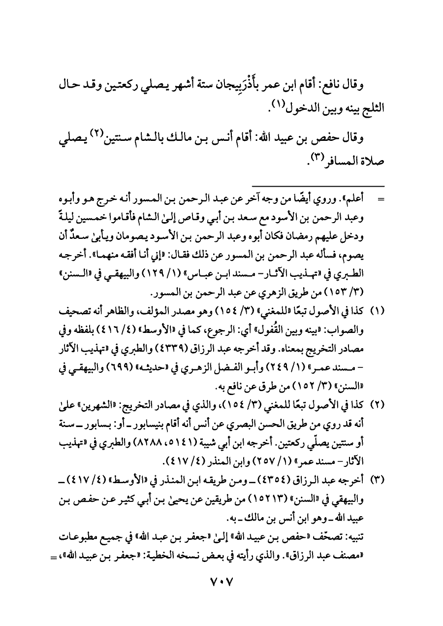 (¬٢) كذا في الأصول تبعًا للمغني (٣/ ١٥٤)، والذي في مصادر التخريج: «الشهرين» على أنه قد روي من طريق الحسن البصري عن أنس أنه أقام بنيسابور ــ أو: بسابور ــ سنة أو سنتين يصلّي ركعتين. أخرجه ابن أبي شيبة (٥١٤١، ٨٢٨٨) والطبري في «تهذيب الآثار- مسند عمر» (١/ ٢٥٧) وابن المنذر (٤/ ٤١٧).
