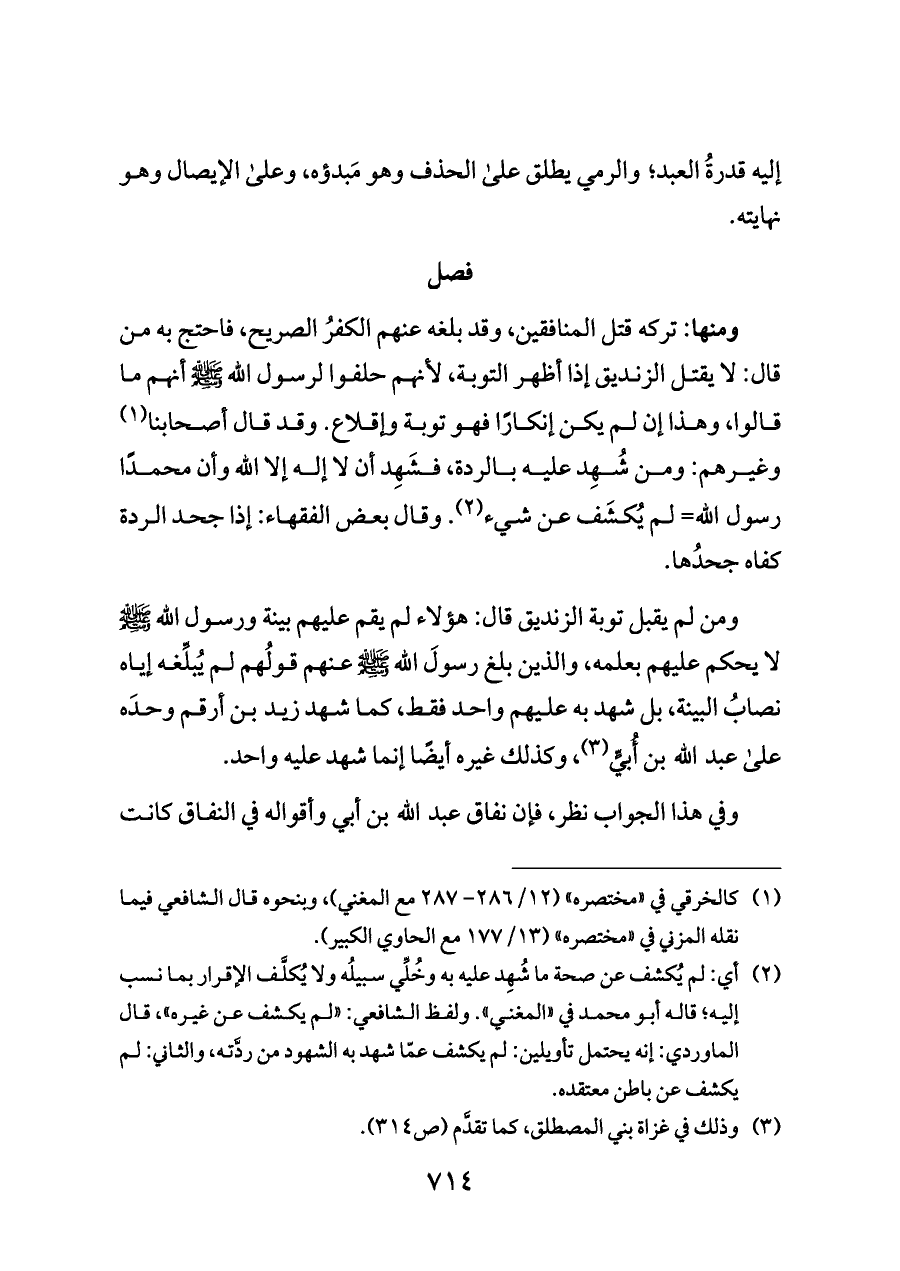 ومن لم يقبل توبة الزنديق قال: هؤلاء لم يقم عليهم بينة ورسول الله - صلى الله عليه وسلم - لا يحكم عليهم بعلمه، والذين بلغ رسولَ الله - صلى الله عليه وسلم - عنهم قولُهم لم يُبلِّغه إياه نصابُ البينة، بل شهد به عليهم واحد فقط، كما شهد زيد بن أرقم وحدَه على عبد الله بن أُبيٍّ (¬٣)، وكذلك غيره أيضًا إنما شهد عليه واحد.