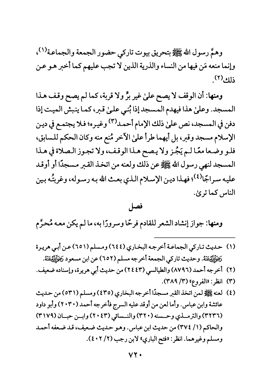 ومنها: أن الوقف لا يصح على غير برٍّ ولا قربة، كما لم يصح وقف هذا المسجد. وعلى هذا فيهدم المسجد إذا بُني على قبر، كما ينبش الميت إذا دفن في المسجد، نص على ذلك الإمام أحمد (¬٣) وغيره؛ فلا يجتمع في دين الإسلام مسجد وقبر، بل أيهما طرأ على الآخر مُنع منه وكان الحكم للسابق، فلو وضعا معًا لم يَجُز ولا يصح هذا الوقف، ولا تجوز الصلاة في هذا المسجد لنهي رسول الله - صلى الله عليه وسلم - عن ذلك ولعنه من اتخذ القبر مسجدًا أو أوقد عليه سراجًا (¬٤)؛ فهذا دين الإسلام الذي بعث الله به رسوله، وغربتُه بين الناس كما ترى.