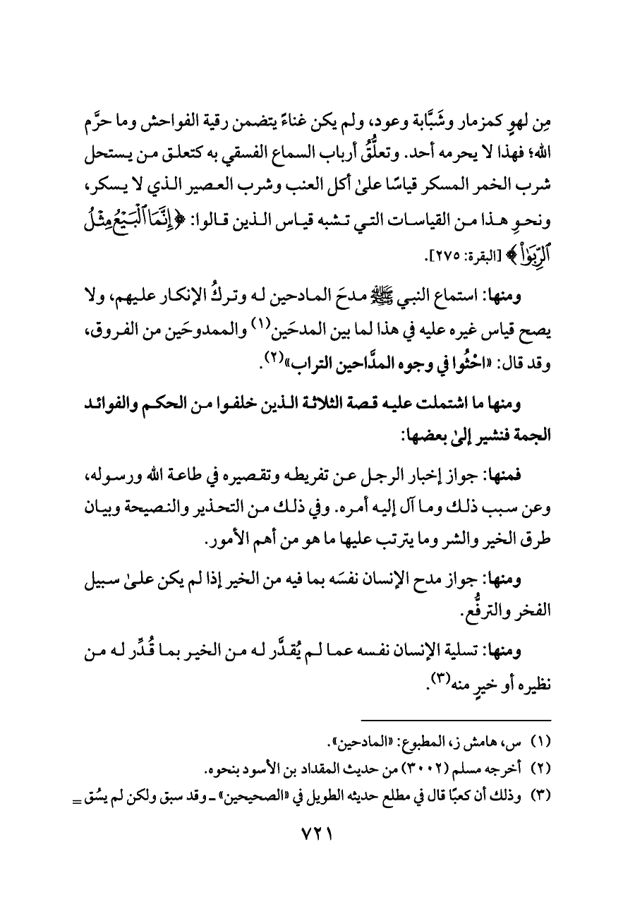 ومنها: استماع النبي - صلى الله عليه وسلم - مدحَ المادحين له وتركُ الإنكار عليهم، ولا يصح قياس غيره عليه في هذا لما بين المدحَين (¬١) والممدوحَين من الفروق، وقد قال: «احْثُوا في وجوه المدَّاحين التراب» (¬٢).