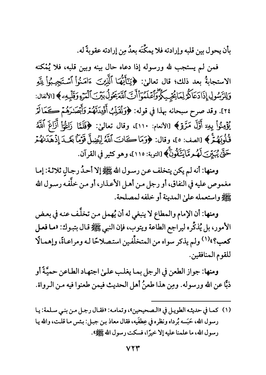 ومنها: أن الإمام والمطاع لا ينبغي له أن يُهمل من تخلَّف عنه في بعض الأمور، بل يُذكِّره ليراجع الطاعة ويتوب، فإن النبي - صلى الله عليه وسلم - قال بتبوك: «ما فعل كعب؟» (¬١) ولم يذكر سواه من المتخلِّفين استصلاحًا له ومراعاةً، وإهمالًا للقوم المنافقين.