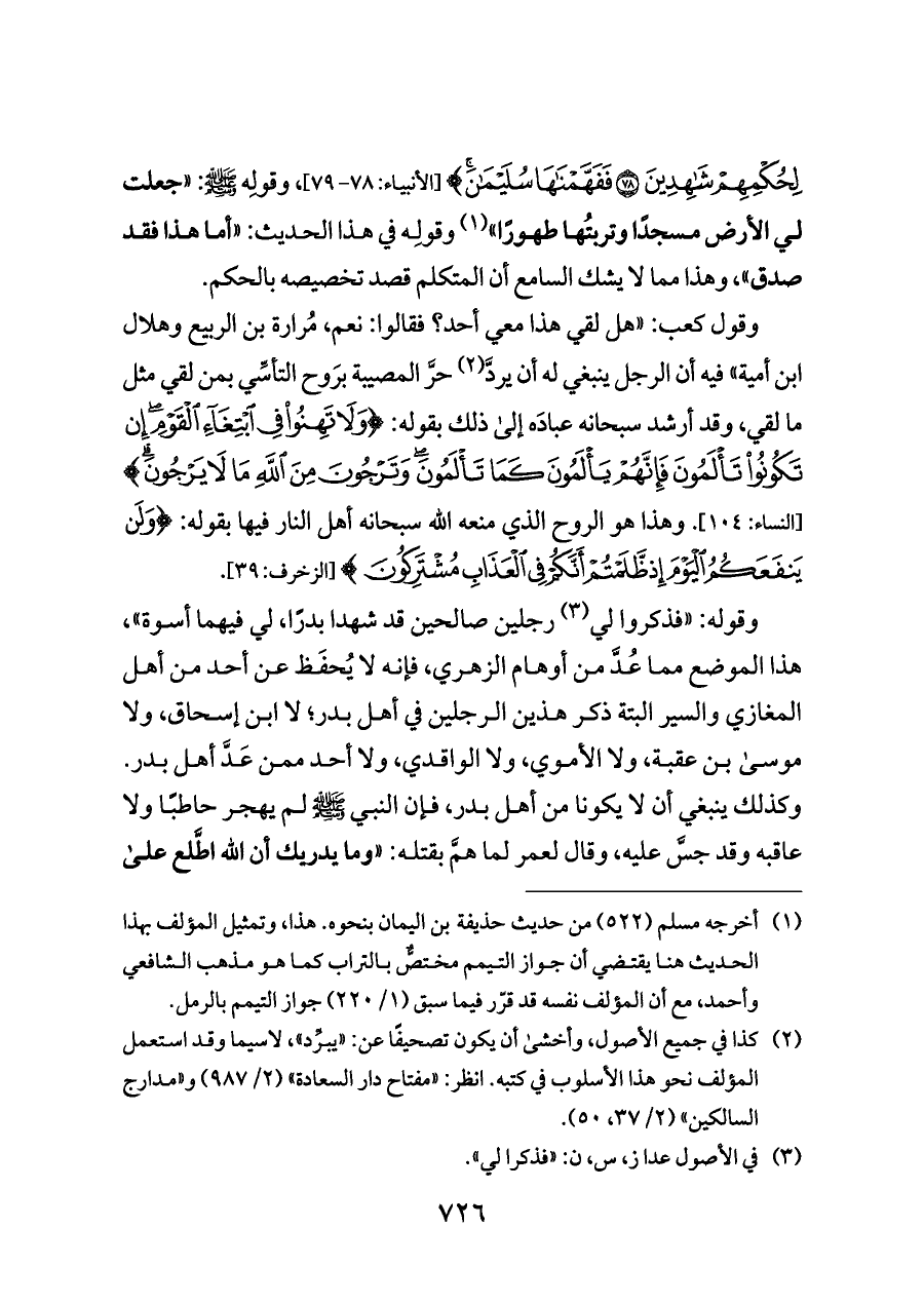 لِحُكْمِهِمْ شَاهِدِينَ (٧٨) فَفَهَّمْنَاهَا سُلَيْمَانَ} [الأنبياء: ٧٨ - ٧٩]، وقولِه - صلى الله عليه وسلم -: «جعلت لي الأرض مسجدًا وتربتُها طهورًا» (¬١) وقولِه في هذا الحديث: «أما هذا فقد صدق»، وهذا مما لا يشك السامع أن المتكلم قصد تخصيصه بالحكم.