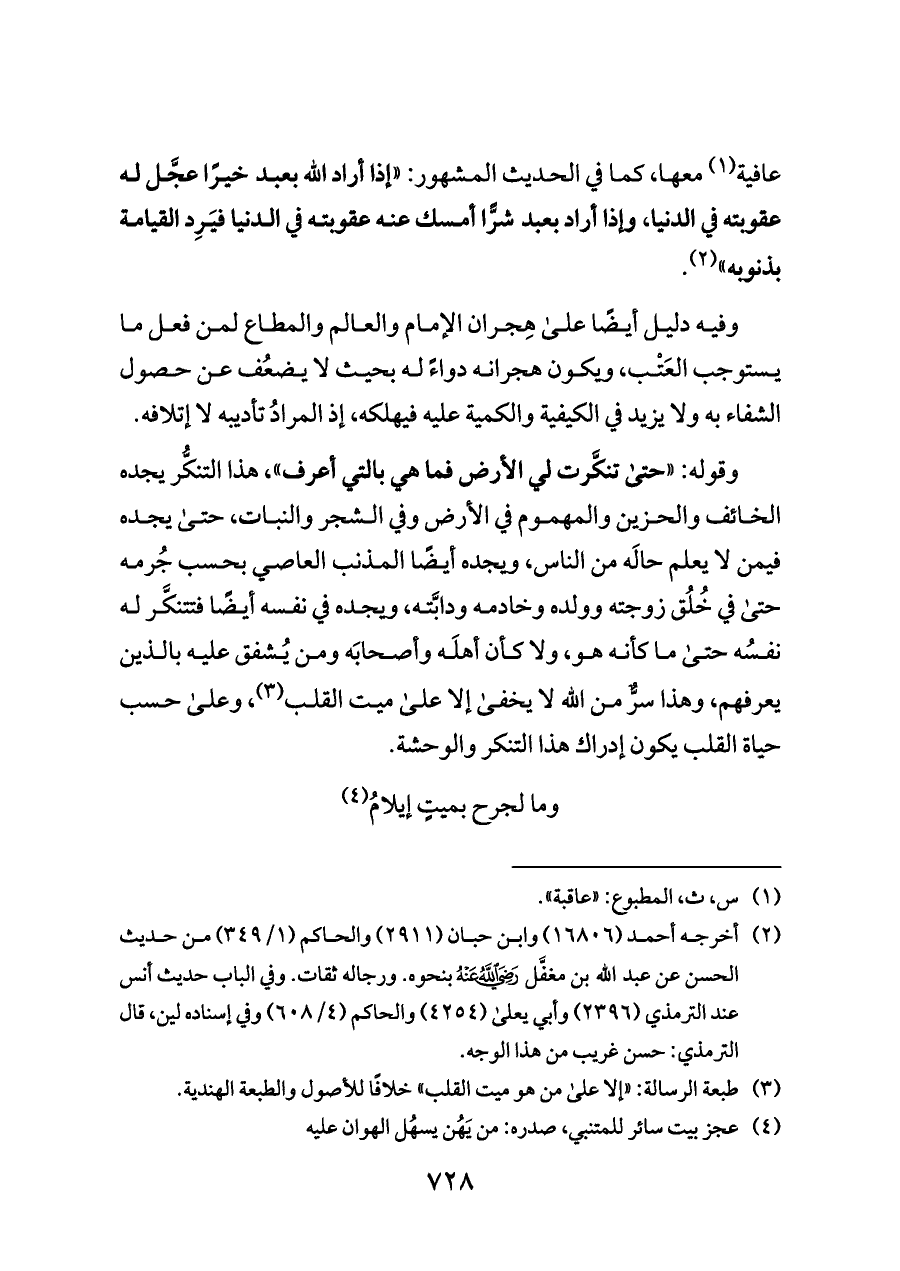 عافية (¬١) معها، كما في الحديث المشهور: «إذا أراد الله بعبد خيرًا عجَّل له عقوبته في الدنيا، وإذا أراد بعبد شرًّا أمسك عنه عقوبته في الدنيا فيَرِد القيامة بذنوبه» (¬٢).