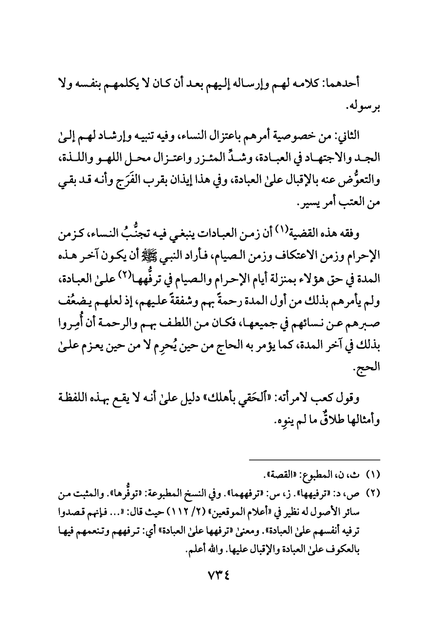 وفقه هذه القضية (¬١) أن زمن العبادات ينبغي فيه تجنُّبُ النساء، كزمن الإحرام وزمن الاعتكاف وزمن الصيام، فأراد النبي - صلى الله عليه وسلم - أن يكون آخر هذه المدة في حق هؤلاء بمنزلة أيام الإحرام والصيام في ترفُّهها (¬٢) على العبادة، ولم يأمرهم بذلك من أول المدة رحمةً بهم وشفقةً عليهم، إذ لعلهم يضعُف صبرهم عن نسائهم في جميعها، فكان من اللطف بهم والرحمة أن أُمِروا بذلك في آخر المدة، كما يؤمر به الحاج من حين يُحرِم لا من حين يعزم على الحج.
