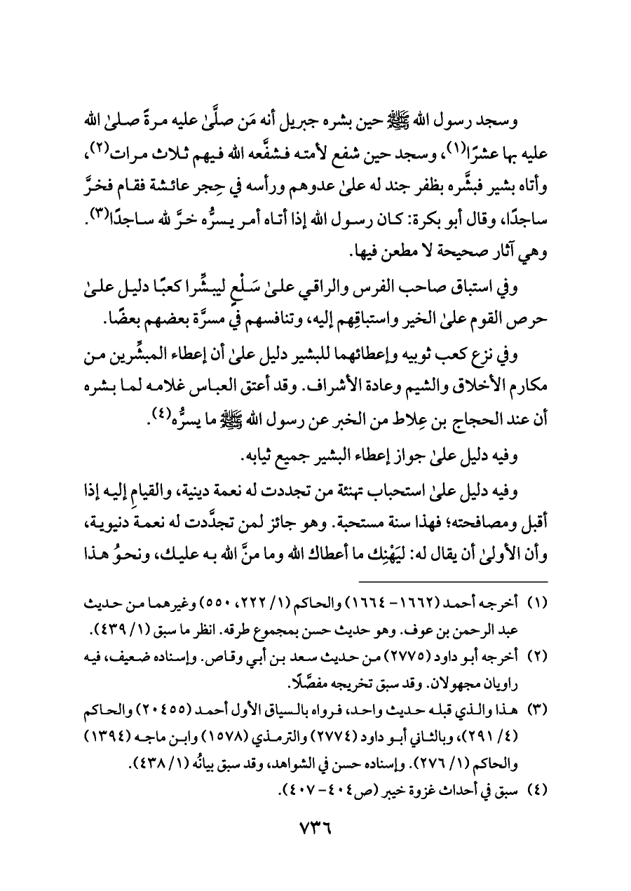 وسجد رسول الله - صلى الله عليه وسلم - حين بشره جبريل أنه مَن صلَّى عليه مرةً صلى الله عليه بها عشرًا (¬١)، وسجد حين شفع لأمته فشفَّعه الله فيهم ثلاث مرات (¬٢)، وأتاه بشير فبشَّره بظفر جند له على عدوهم ورأسه في حِجر عائشة فقام فخرَّ ساجدًا، وقال أبو بكرة: كان رسول الله إذا أتاه أمر يسرُّه خرَّ لله ساجدًا (¬٣). وهي آثار صحيحة لا مطعن فيها.