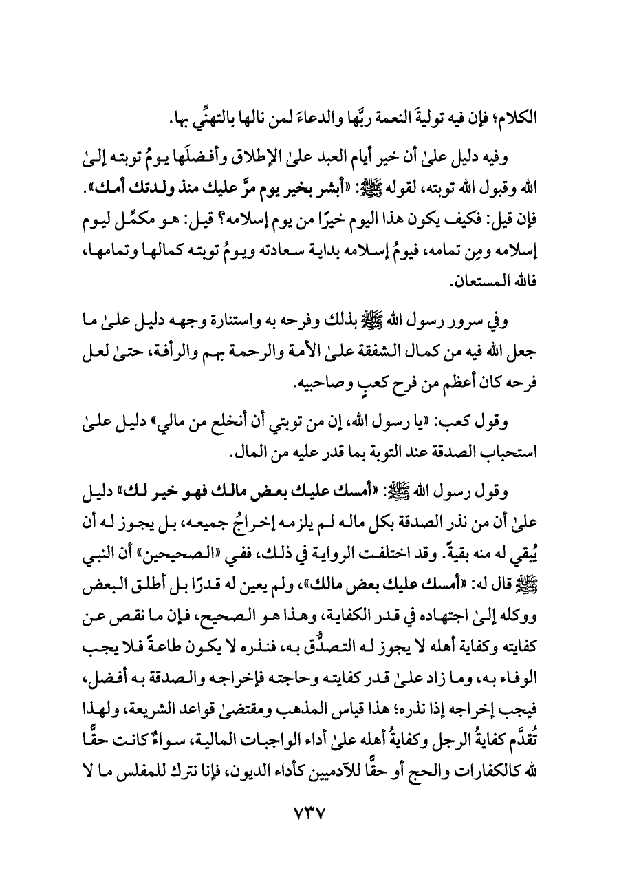 وفيه دليل على أن خير أيام العبد على الإطلاق وأفضلَها يومُ توبته إلى الله وقبول الله توبته، لقوله - صلى الله عليه وسلم -: «أبشر بخير يوم مرَّ عليك منذ ولدتك أمك». فإن قيل: فكيف يكون هذا اليوم خيرًا من يوم إسلامه؟ قيل: هو مكمِّل ليوم إسلامه ومِن تمامه، فيومُ إسلامه بداية سعادته ويومُ توبته كمالها وتمامها، فالله المستعان.