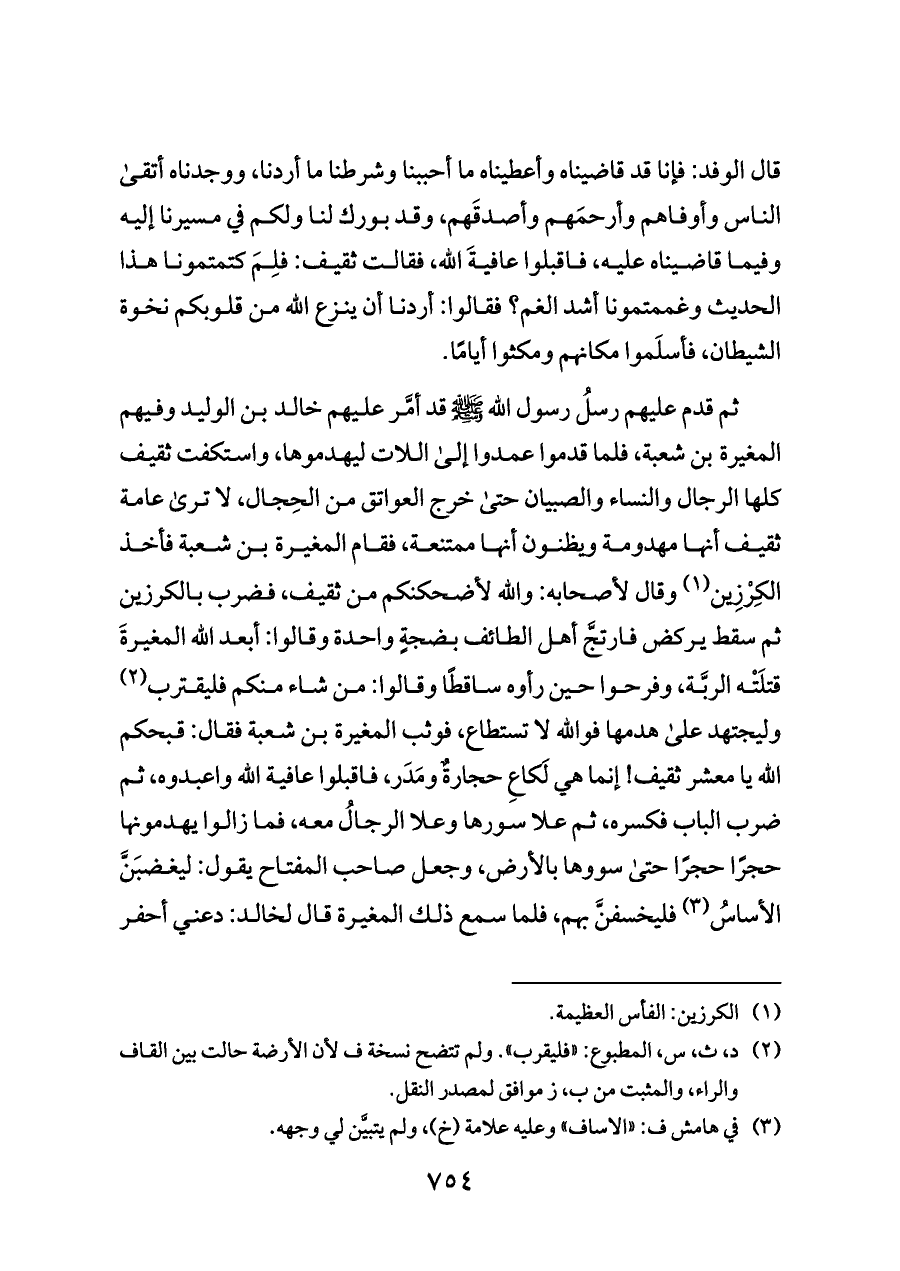قال الوفد: فإنا قد قاضيناه وأعطيناه ما أحببنا وشرطنا ما أردنا، ووجدناه أتقى الناس وأوفاهم وأرحمَهم وأصدقَهم، وقد بورك لنا ولكم في مسيرنا إليه وفيما قاضيناه عليه، فاقبلوا عافيةَ الله، فقالت ثقيف: فلِمَ كتمتمونا هذا الحديث وغممتمونا أشد الغم؟ فقالوا: أردنا أن ينزع الله من قلوبكم نخوة الشيطان، فأسلَموا مكانهم ومكثوا أيامًا.