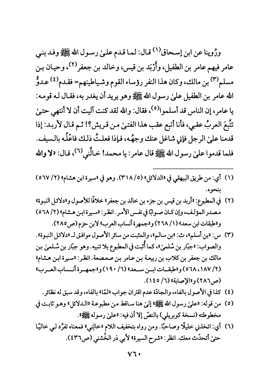 ورُوينا عن ابن إسحاق (¬١) قال: لما قدم على رسول الله - صلى الله عليه وسلم - وفد بني عامر فيهم عامر بن الطفيل، وأَرْبَد بن قيس، وخالد بن جعفر (¬٢)، وحيان بن مسلم (¬٣) بن مالك، وكان هذا النفر رؤساء القوم وشياطينهم= فقدم (¬٤) عدوُّ الله عامر بن الطفيل على رسول الله - صلى الله عليه وسلم - وهو يريد أن يغدر به، فقال له قومه: يا عامر، إن الناس قد أسلموا (¬٥)، فقال: والله لقد كنت آليت أن لا أنتهي حتى تتَّبعَ العربُ عقبي، فأنا أتبع عقب هذا الفتى من قريش؟! ثم قال لأربد: إذا قدمنا على الرجل فإني شاغل عنك وجهُه، فإذا فعلتُ ذلك فاعْلُه بالسيف. فلما قدموا على رسول الله - صلى الله عليه وسلم - قال عامر: يا محمد! خالَّني (¬٦)،