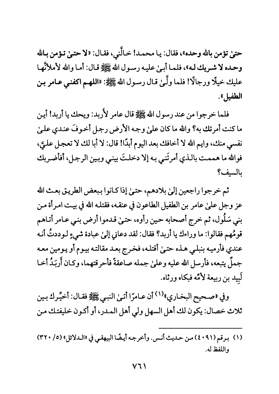 حتى تؤمن بالله وحده»، فقال: يا محمد! خالَّني، فقال: «لا حتى تؤمن بالله وحده لا شريك له»، فلما أبى عليه رسول الله - صلى الله عليه وسلم - قال: أما والله لأملأنَّها عليك خيلًا ورجالًا! فلما ولَّى قال رسول الله - صلى الله عليه وسلم -: «اللهم اكفني عامر بن الطفيل».