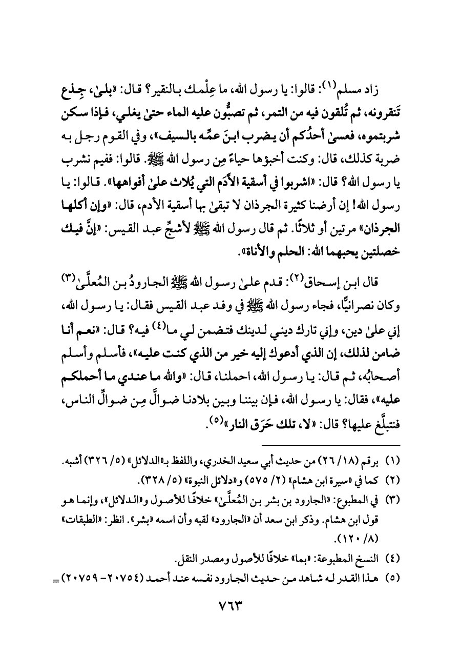 (¬٣) في المطبوع: «الجارود بن بشر بن المُعلَّى» خلافًا للأصول و «الدلائل»، وإنما هو قول ابن هشام. وذكر ابن سعد أن «الجارود» لقبه وأن اسمه «بشر». انظر: «الطبقات» (٨/ ١٢٠).