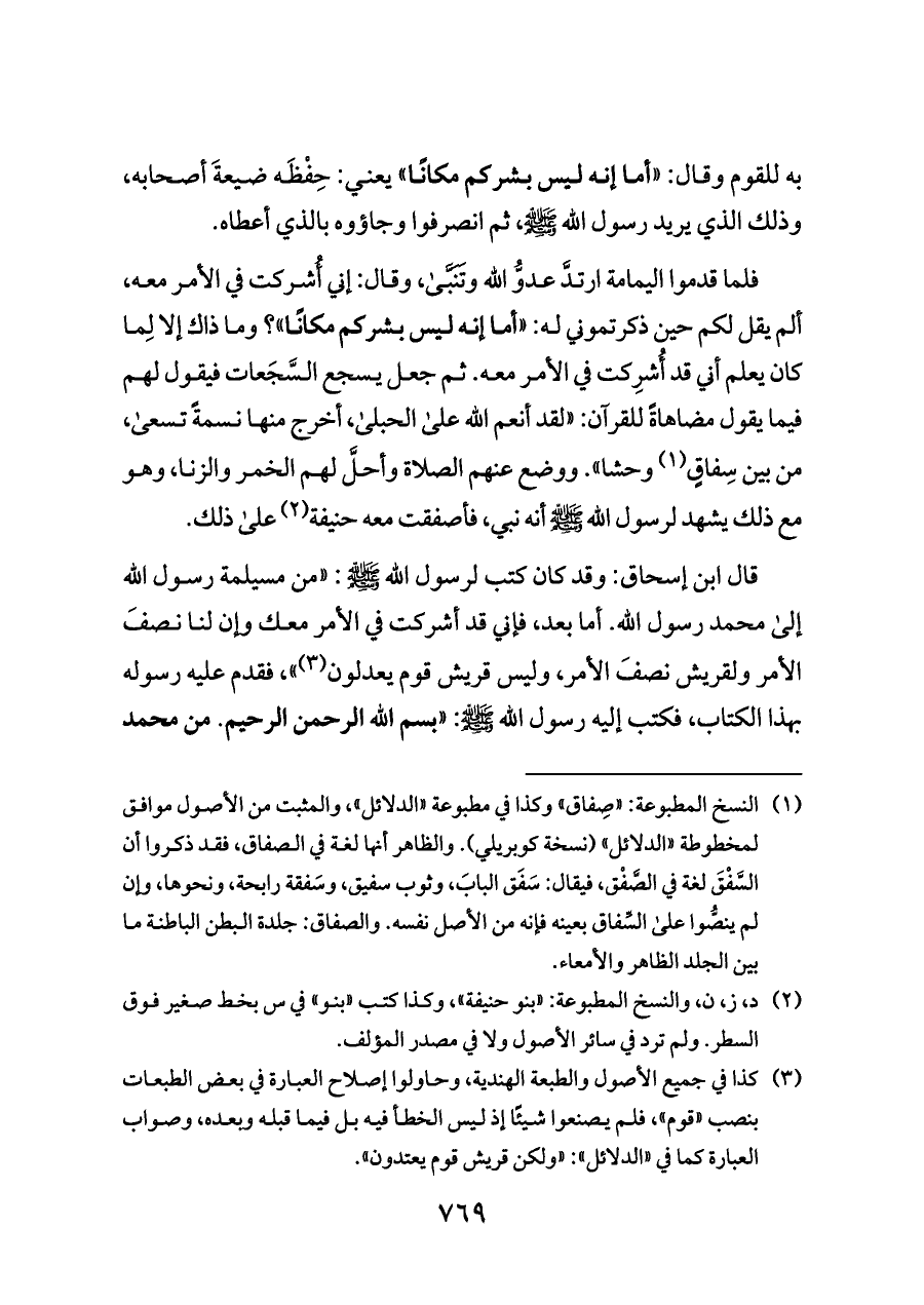 (¬٣) كذا في جميع الأصول والطبعة الهندية، وحاولوا إصلاح العبارة في بعض الطبعات بنصب «قوم»، فلم يصنعوا شيئًا إذ ليس الخطأ فيه بل فيما قبله وبعده، وصواب العبارة كما في «الدلائل»: «ولكن قريش قوم يعتدون».