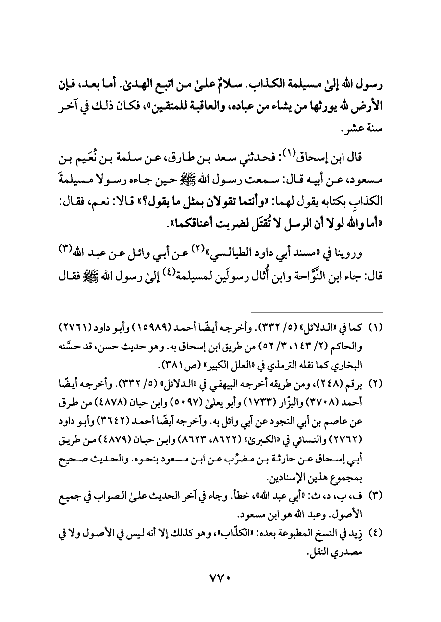 رسول الله إلى مسيلمة الكذاب. سلامٌ على من اتبع الهدى. أما بعد، فإن الأرض لله يورثها من يشاء من عباده، والعاقبة للمتقين»، فكان ذلك في آخر سنة عشر.