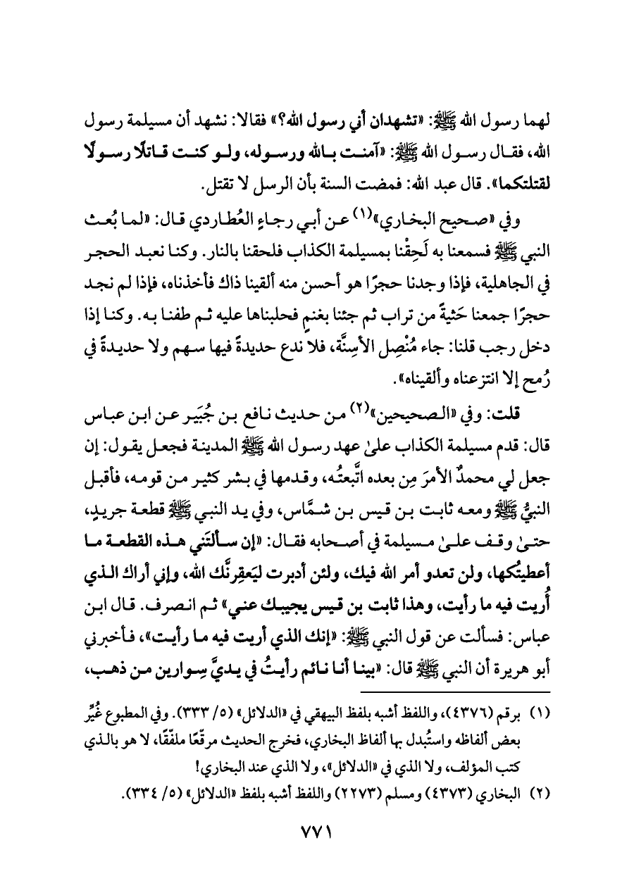 لهما رسول الله - صلى الله عليه وسلم -: «تشهدان أني رسول الله؟» فقالا: نشهد أن مسيلمة رسول الله، فقال رسول الله - صلى الله عليه وسلم -: «آمنت بالله ورسوله، ولو كنت قاتلًا رسولًا لقتلتكما». قال عبد الله: فمضت السنة بأن الرسل لا تقتل.