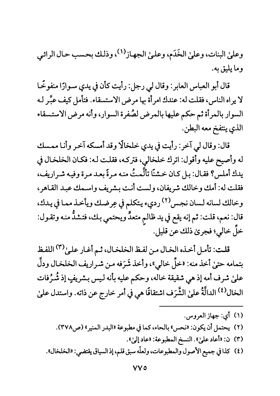 قال: وقال لي آخر: رأيت في يدي خلخالًا وقد أمسكه آخر وأنا ممسك له وأصيح عليه وأقول: اترك خلخالي، فتركه، فقلت له: فكان الخلخال في يدك أملس؟ فقال: بل كان خشنًا تألَّمتُ منه مرةً بعد مرة وفيه شراريف، فقلت له: أمك وخالك شريفان، ولست أنت بشريف واسمك عبد القاهر، وخالك لسانه لسان نجس (¬٢) رديء يتكلم في عِرضك ويأخذ مما في يدك، قال: نعم، قلت: ثم إنه يقع في يد ظالمٍ متعدٍّ ويحتمي بك، فتشدُّ منه وتقول: خلِّ خالي؛ فجرى ذلك عن قليل.