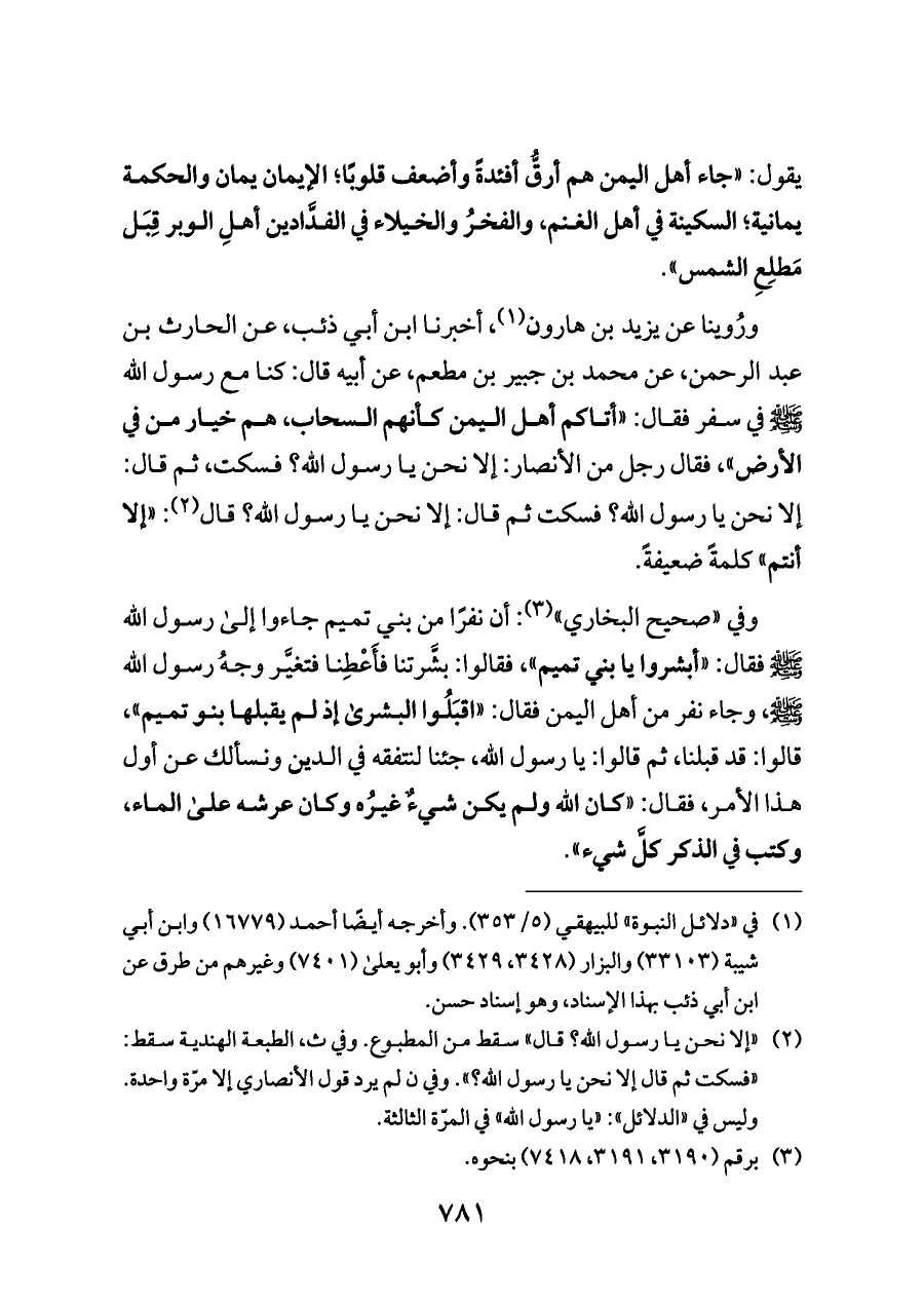 وفي «صحيح البخاري» (¬٣): أن نفرًا من بني تميم جاءوا إلى رسول الله - صلى الله عليه وسلم - فقال: «أبشروا يا بني تميم»، فقالوا: بشَّرتنا فأَعْطِنا فتغيَّر وجهُ رسول الله - صلى الله عليه وسلم -، وجاء نفر من أهل اليمن فقال: «اقبَلُوا البشرى إذ لم يقبلها بنو تميم»، قالوا: قد قبلنا، ثم قالوا: يا رسول الله، جئنا لنتفقه في الدين ونسألك عن أول هذا الأمر، فقال: «كان الله ولم يكن شيءٌ غيرُه وكان عرشه على الماء، وكتب في الذكر كلَّ شيء».