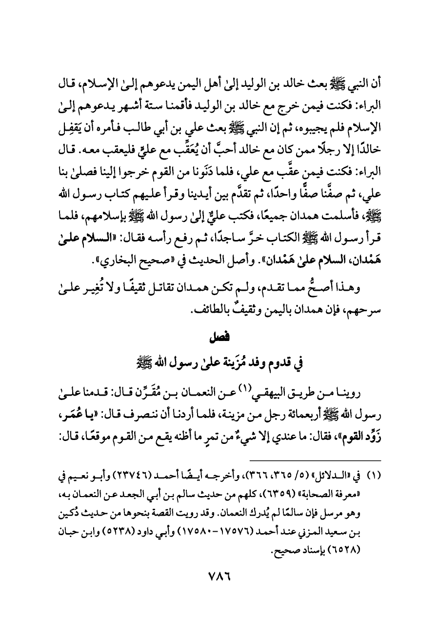أن النبي - صلى الله عليه وسلم - بعث خالد بن الوليد إلى أهل اليمن يدعوهم إلى الإسلام، قال البراء: فكنت فيمن خرج مع خالد بن الوليد فأقمنا ستة أشهر يدعوهم إلى الإسلام فلم يجيبوه، ثم إن النبي - صلى الله عليه وسلم - بعث علي بن أبي طالب فأمره أن يَقفِل خالدًا إلا رجلًا ممن كان مع خالد أحبَّ أن يُعَقِّب مع عليٍّ فليعقب معه. قال البراء: فكنت فيمن عقَّب مع علي، فلما دَنَونا من القوم خرجوا إلينا فصلى بنا علي، ثم صفَّنا صفًّا واحدًا، ثم تقدَّم بين أيدينا وقرأ عليهم كتاب رسول الله - صلى الله عليه وسلم -، فأسلمت همدان جميعًا، فكتب عليٌّ إلى رسول الله - صلى الله عليه وسلم - بإسلامهم، فلما قرأ رسول الله - صلى الله عليه وسلم - الكتاب خرَّ ساجدًا، ثم رفع رأسه فقال: «السلام على هَمْدان، السلام على هَمْدان». وأصل الحديث في «صحيح البخاري».